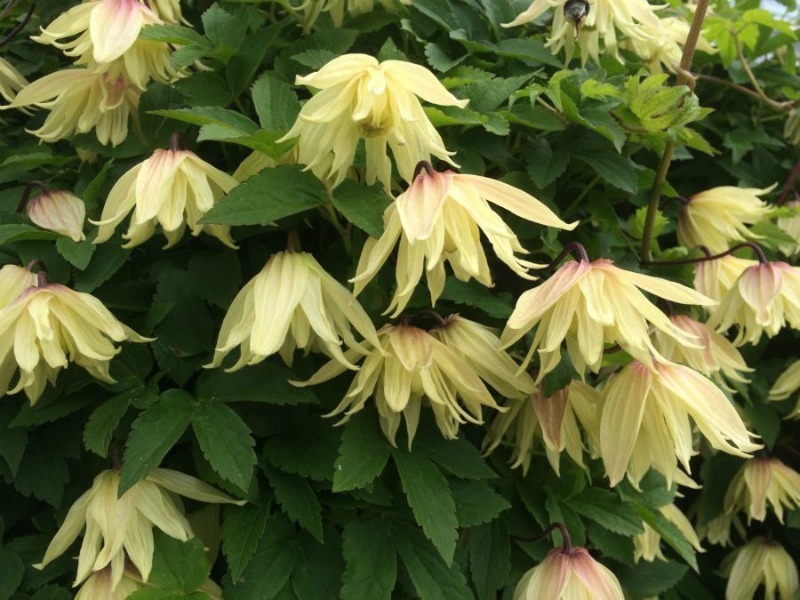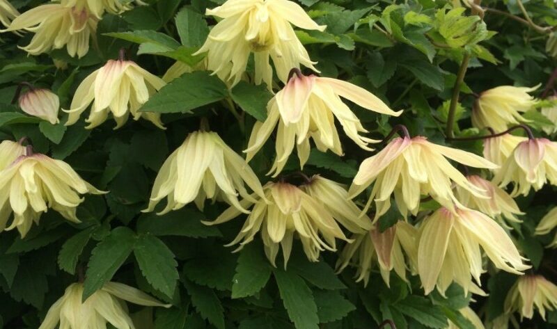 Este cultivar de Clematis chiinsanensis, bautizado con el nombre de  ‘Amber’, tiene las flores amarillas y tan solo unos suaves tonos rosas en la parte trasera de los sépalos, que desaparecen cuando la planta está expuesta a la luz solar directa.