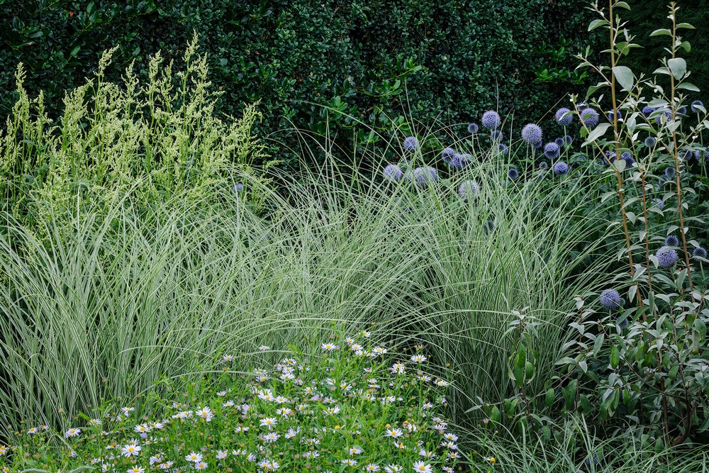 Panicum virgatum ‘Northwind’ crea contraste de color y un fuerte acento vertical dentro de la plantación. El movimiento y textura lo aporta otra gramínea ornamental, Calamagrostisx acutiflora ‘Overdam’, que, al igual que las inflorescencias de Echinops, proporciona tonos helados.