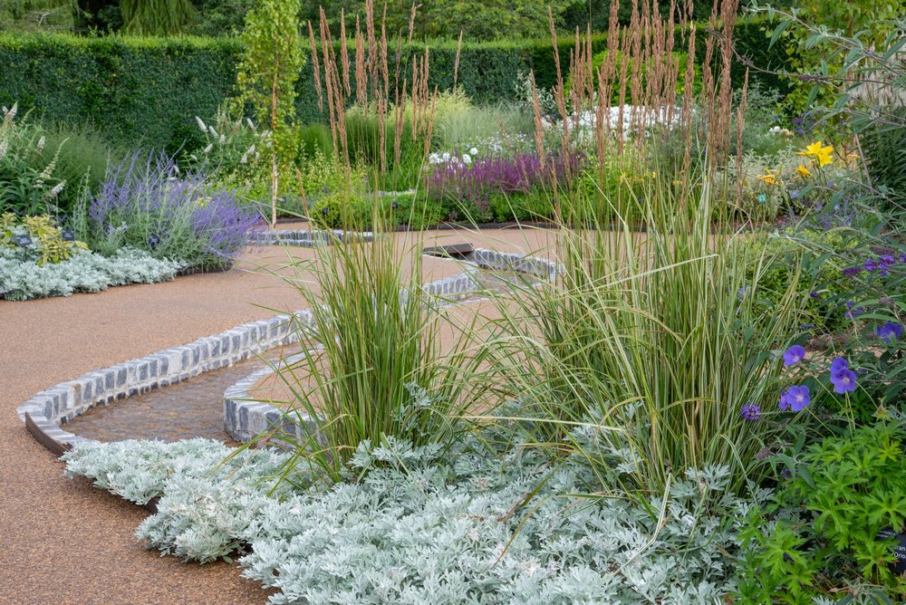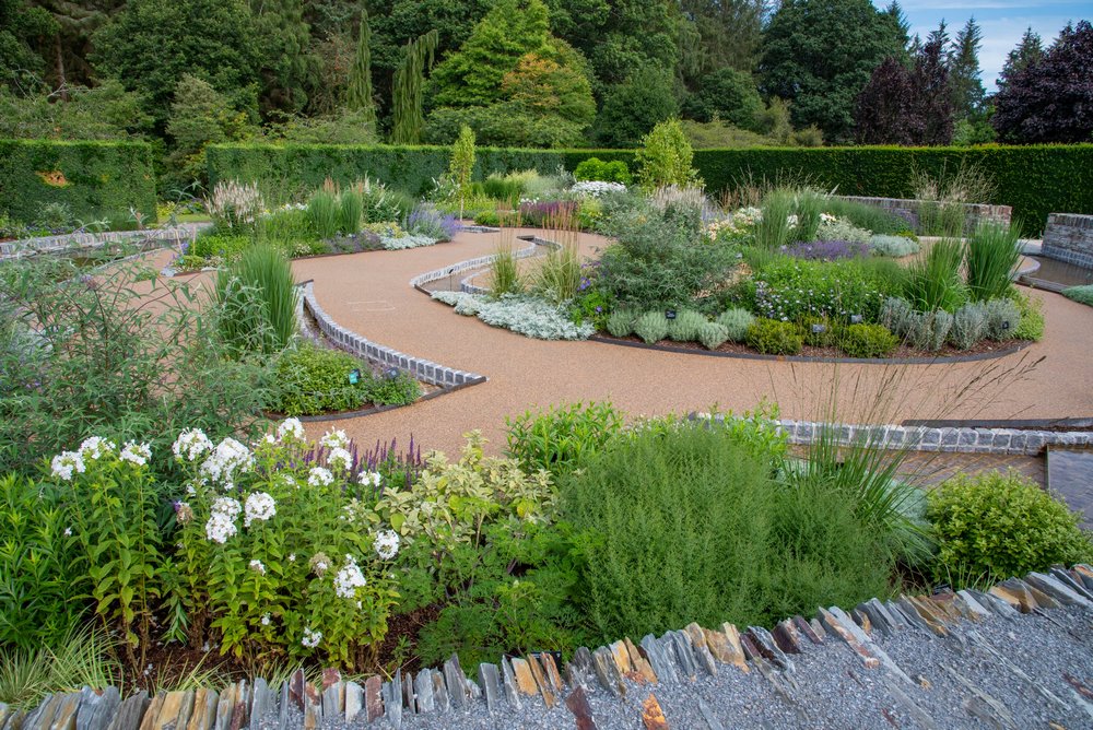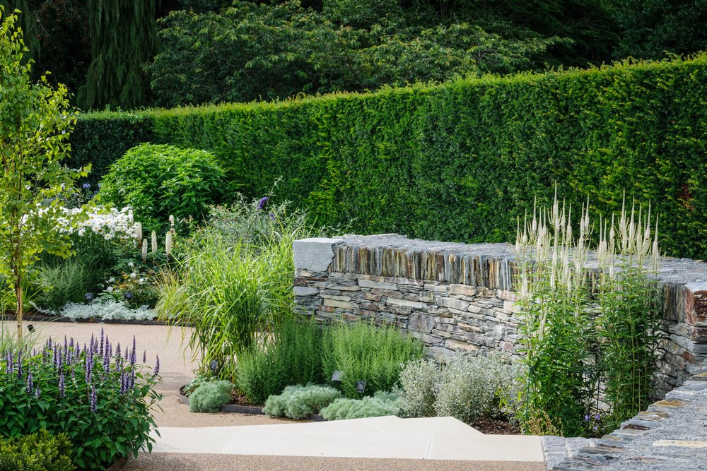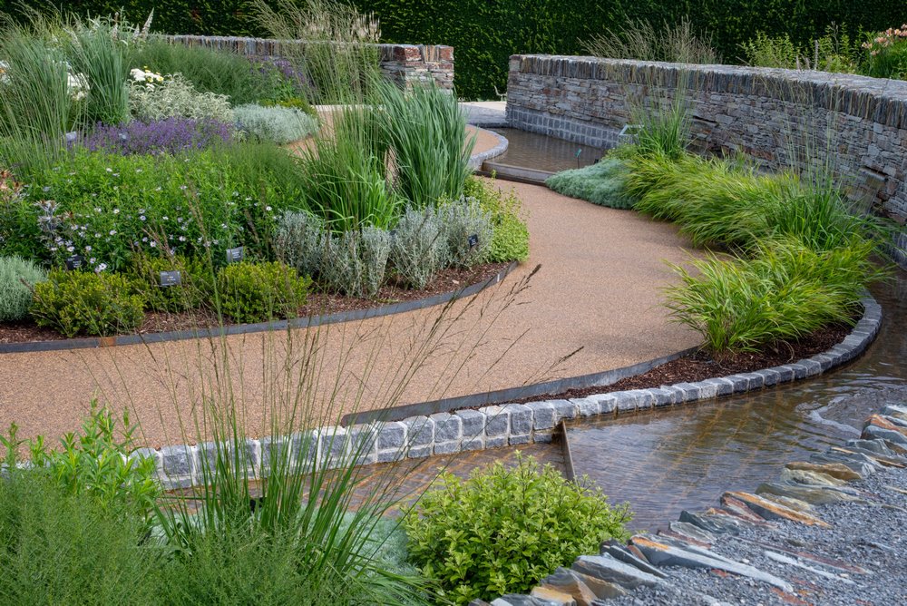 Los senderos en la zona inferior son de grava unida a resina permeable al agua con el fin de reducir la escorrentía del agua superficial. La pared curva en la parte superior del jardín está construida en piedra seca, una característica del campo de Devon.