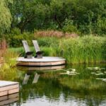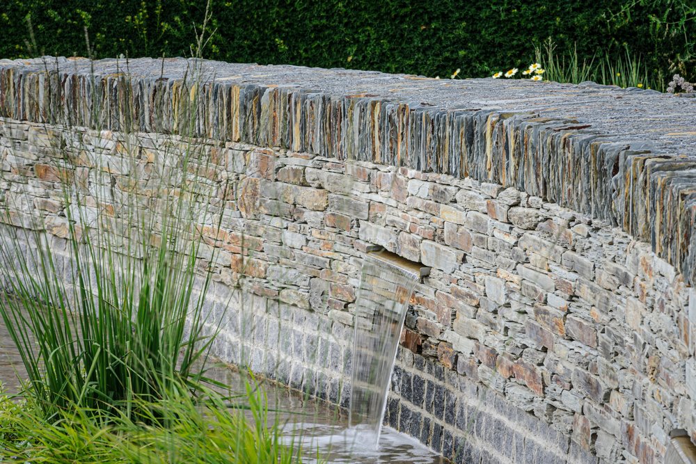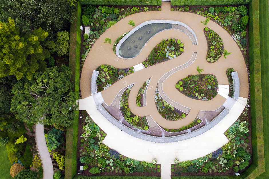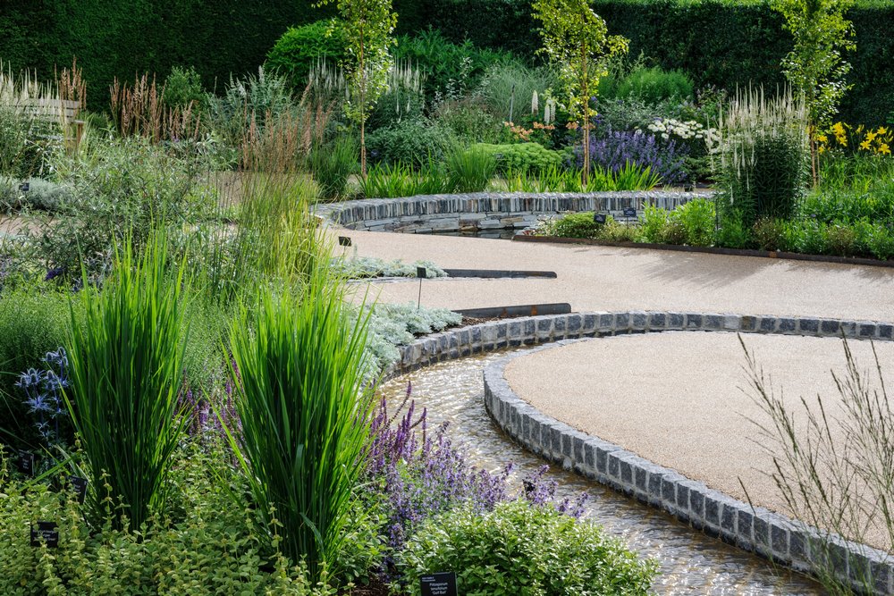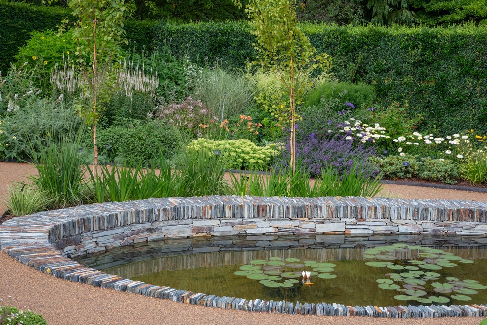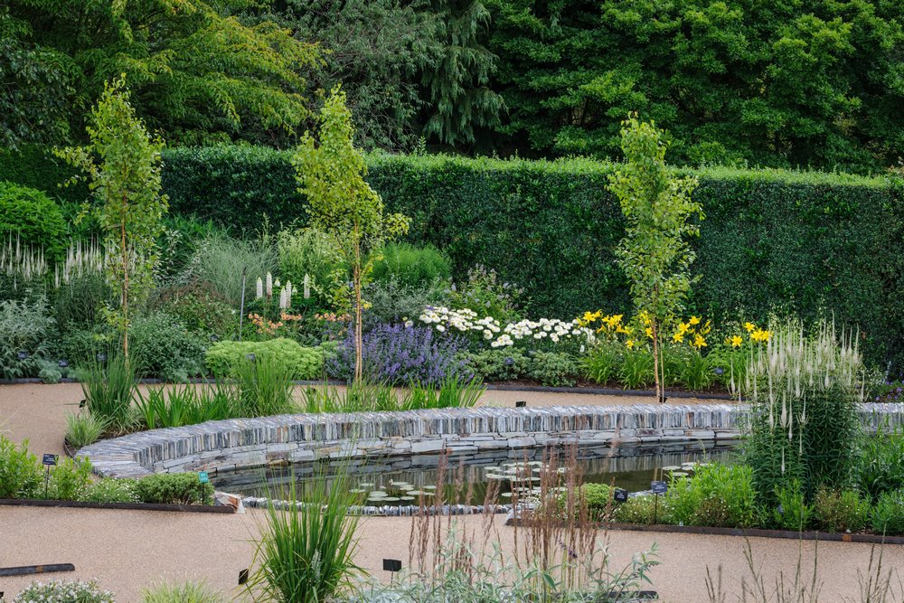 Y así fue. Da la impresión de que hay un flujo directo de cinco cuchillas de agua colocadas en una pared baja de piedra seca en la parte superior del jardín, que alimentan los riachuelos curvos y poco profundos que luego se enconden bajo tierra antes de emerger en el gran estanque que hay en el punto más bajo del jardín. De este modo, el agua fluye desde la parte alta hasta la zona más pantanosacomo lo haría en un paisaje natural.