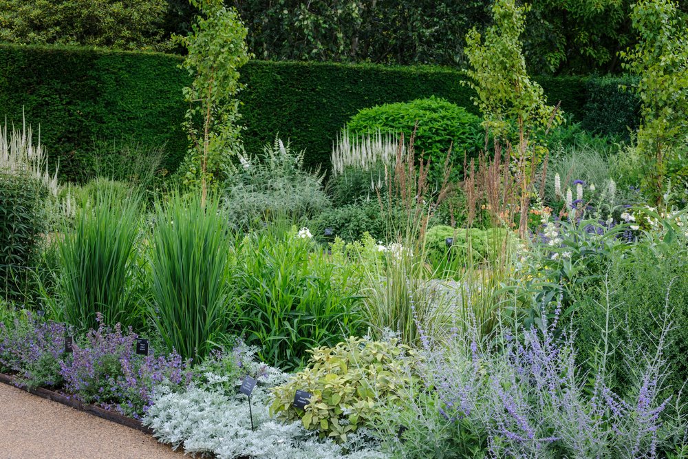 El esquema de plantación se basa en la plantación relajada del antiguo Spiral Garden diseñado por Tom Stuart-Smith. Incluye plantas con flores azules, blancas y tonos pastel que se complementan con el follaje gris y crean un vínculo visual con el agua. Una paleta de colores que proporciona un contraste relajante a los colores vivos del cercano Hot Garden, que presenta rojos, naranjas, púrpuras y amarillos, creando un resplandor de colores brillantes en verano, tal y como he mostrado anteriormente en el blog.