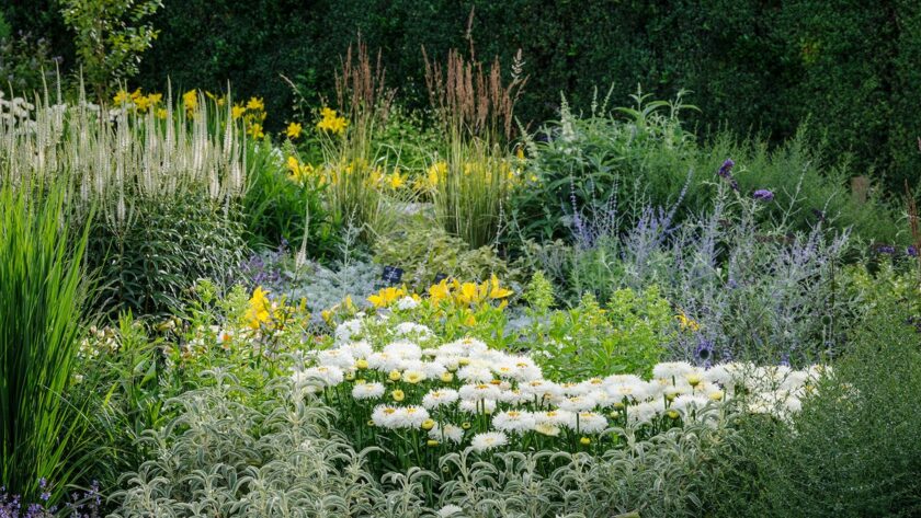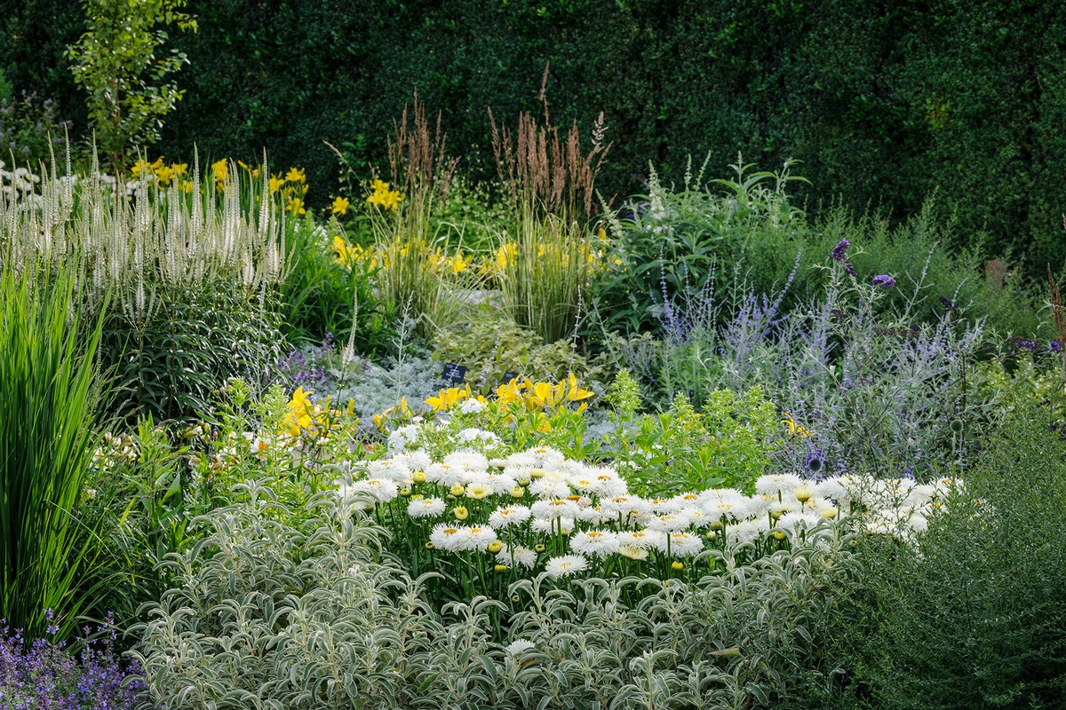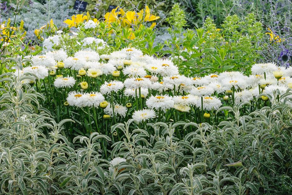 Los tonos blancos o pastel los proporcionan las flores de margaritas como Leucanthemum x superbum ‘Real Galaxy’, que combina bien con los tonos plateados que proporciona el follaje de Phlomis fruticosa y las flores amarillas de Hemerocallis ‘Lark Son’.