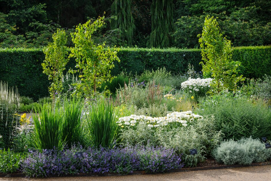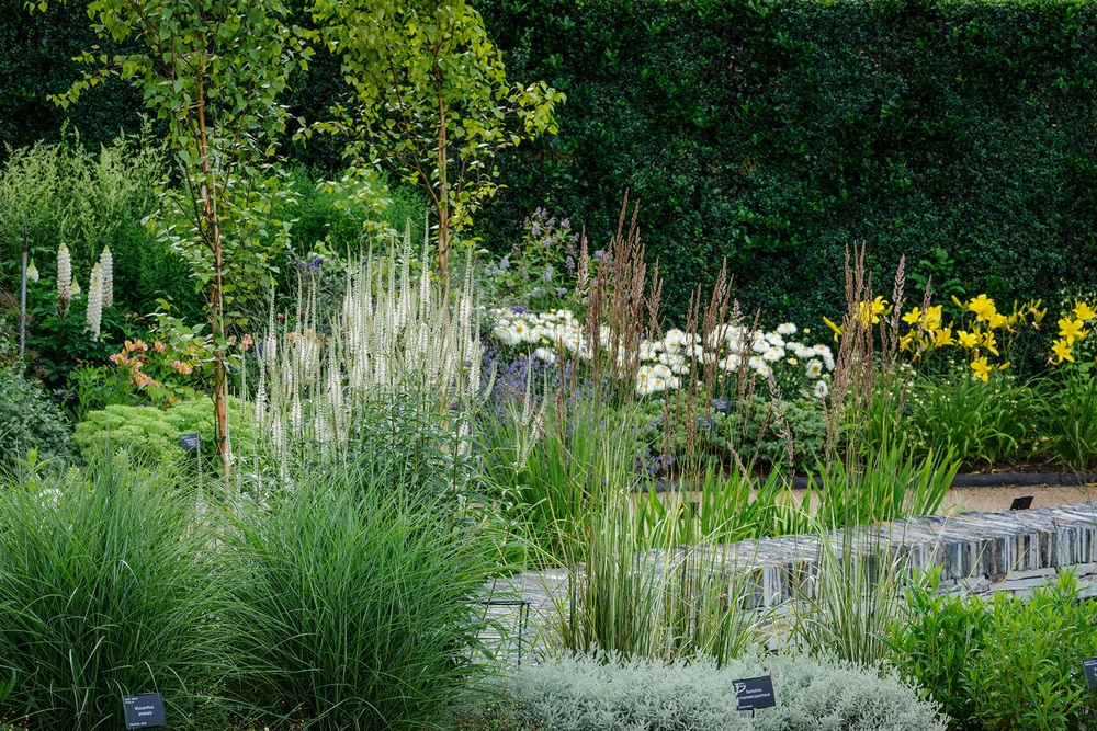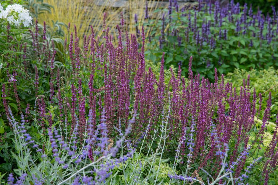 La plantación herbácea incluye geranios resistentes, como Geranium ‘Orion’, con flores azules que se repiten durante todo el verano, junto al popular Geranium‘Rozanne’. No faltan coloridos bloques de Salvia nemorosa‘Amethyst’, cuyas agujas de flores de color lila-púrpura contrastan bien con las flores de Perovskia y Agastache.
