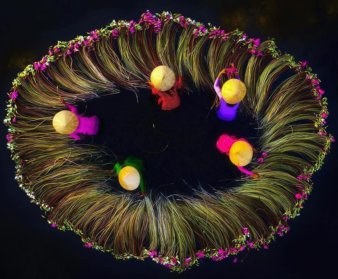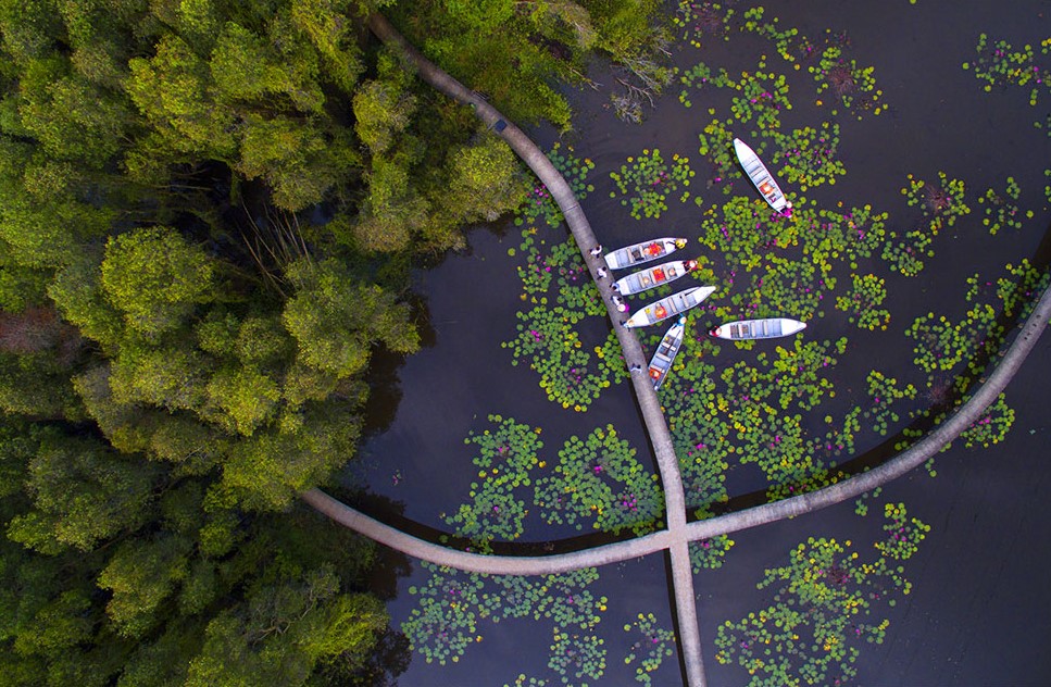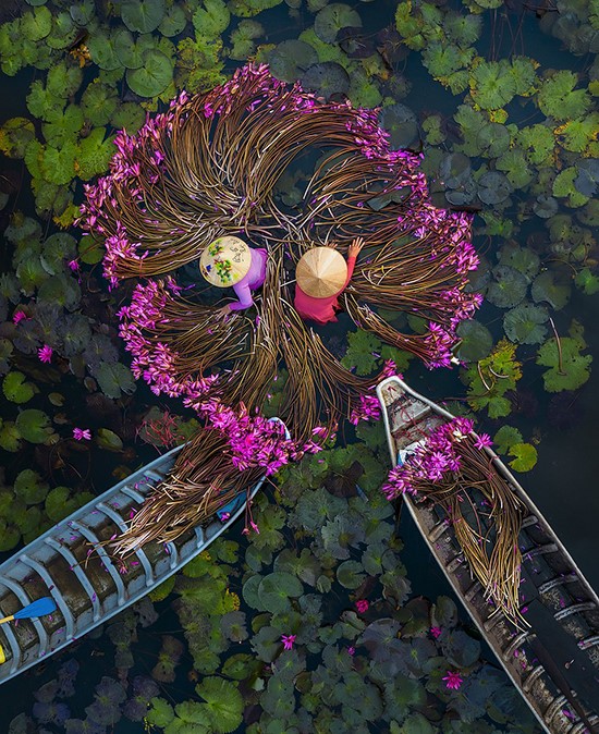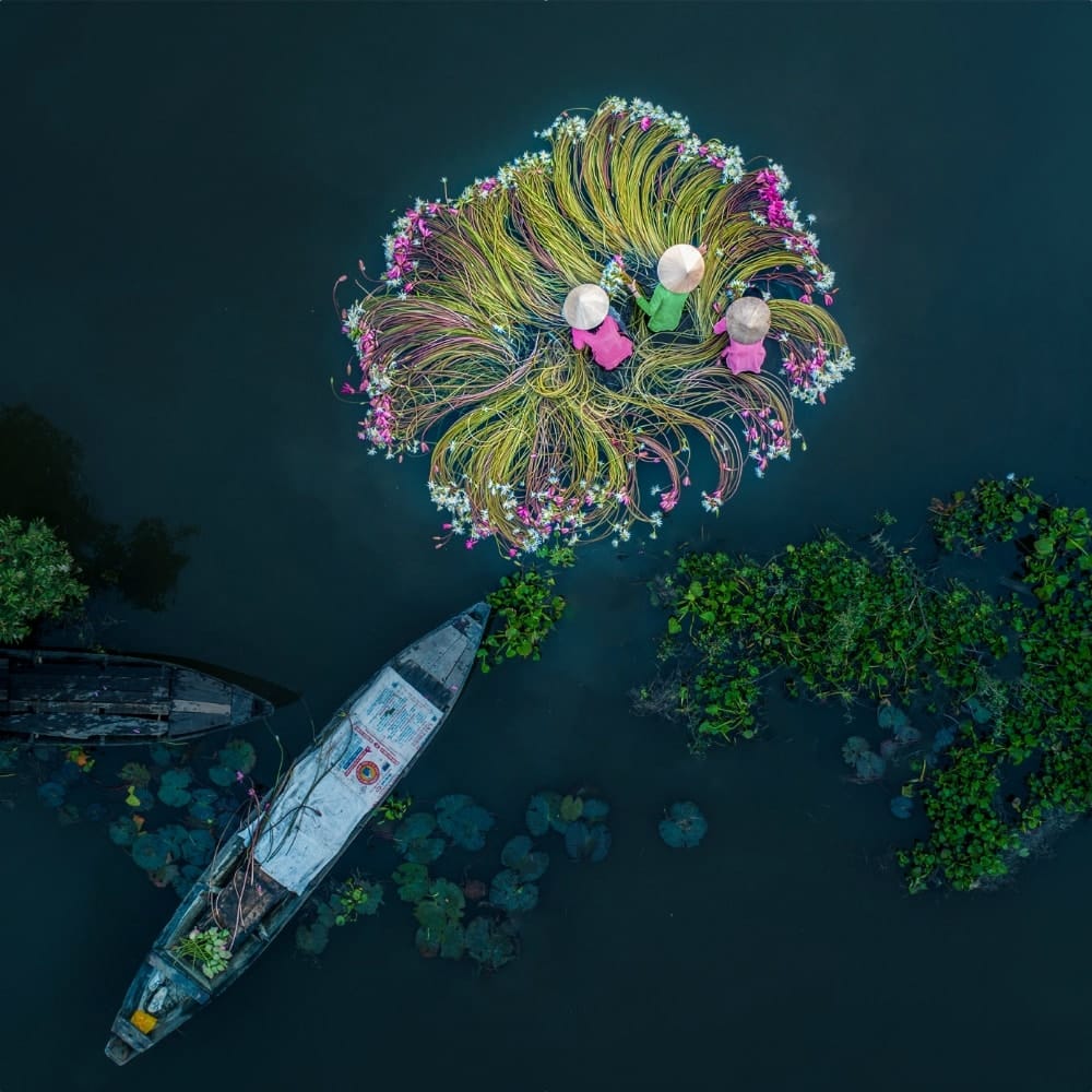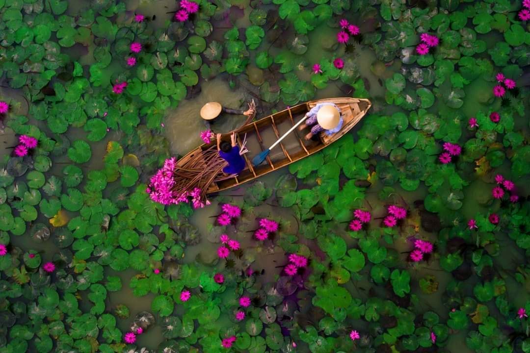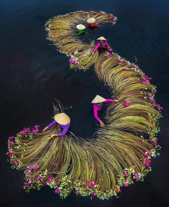Esa cosecha diaria regala escenas de paisaje agrícola que suelen ser recogidas en espectaculares fotografías, donde destacan especialmente las vistas aéreas de los agricultores cosechando los nenúfares. Son impresionantes.