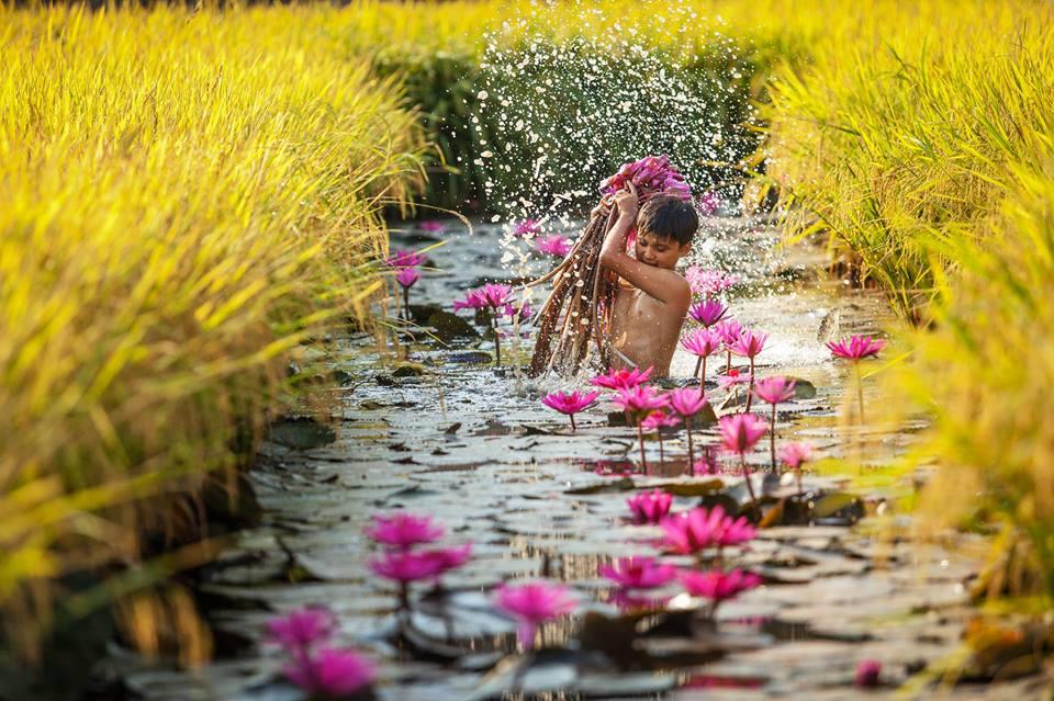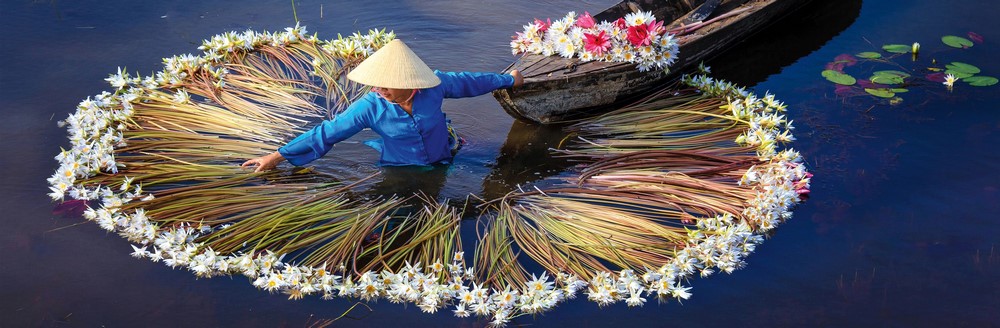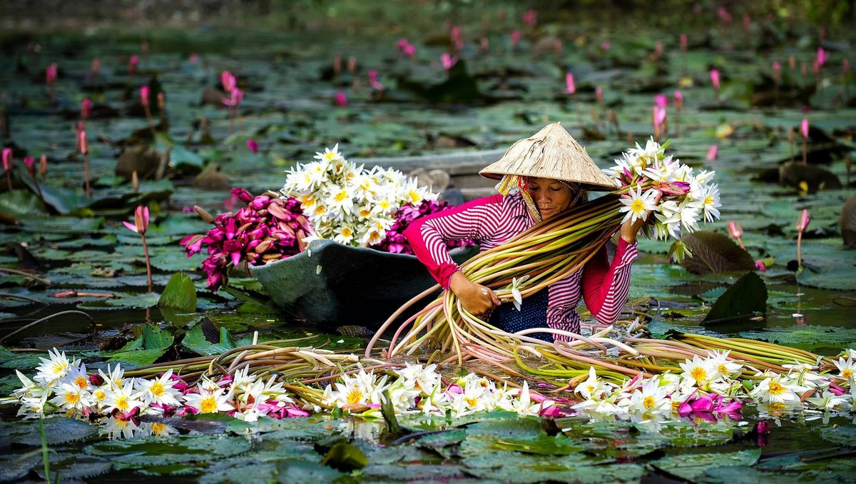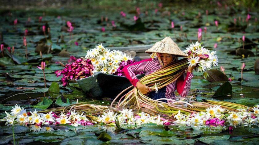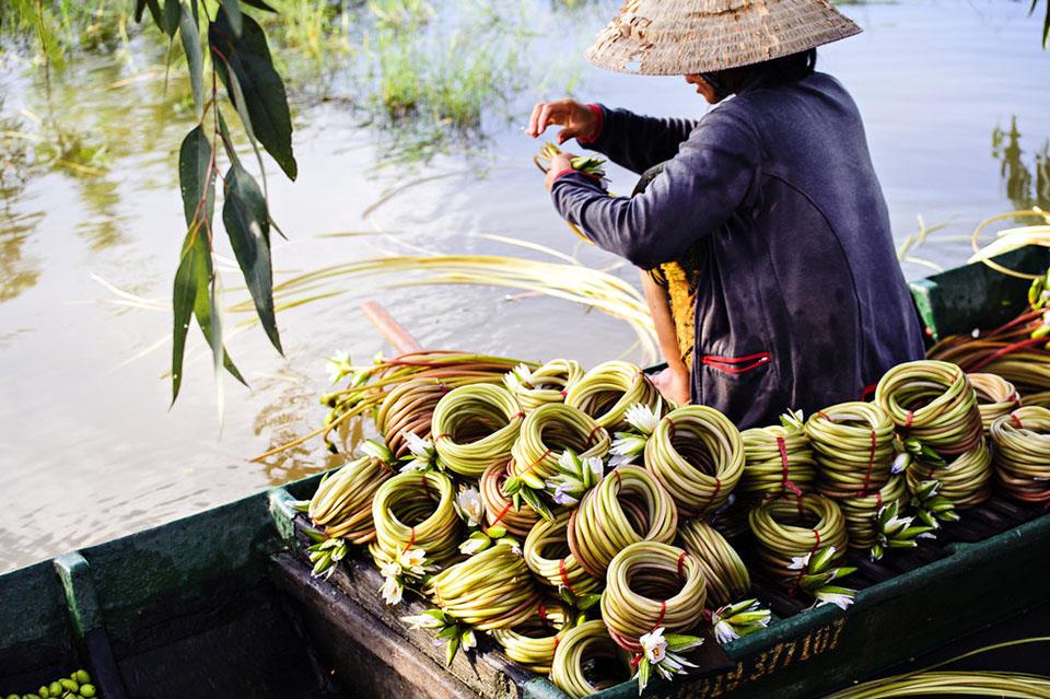 Cosecha de nenúfares en el Delta del Mekong, Vietnam