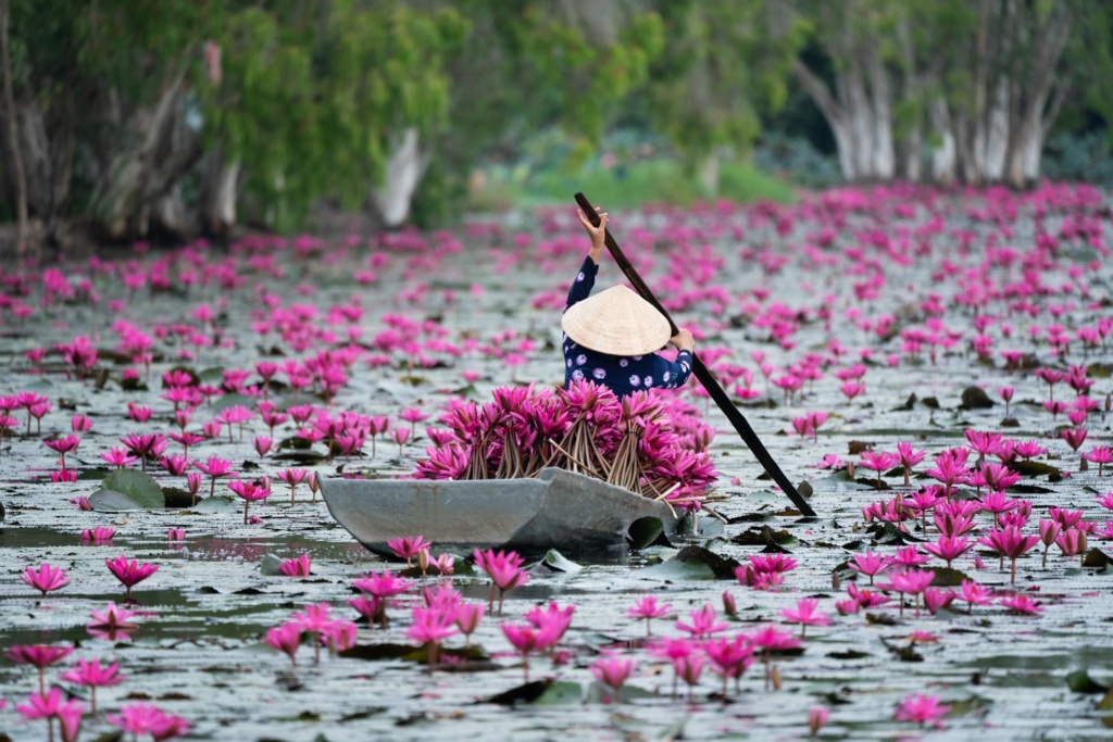 Los nenúfares ( Nymphaea), que son un símbolo icónico en el Delta del Mekong, florecen durante la temporada de lluvias, cuando los canales y los campos de arroz se desbordan, y su temporada de floración llega antes al Delta del Mekong que al norte de Vietnam.