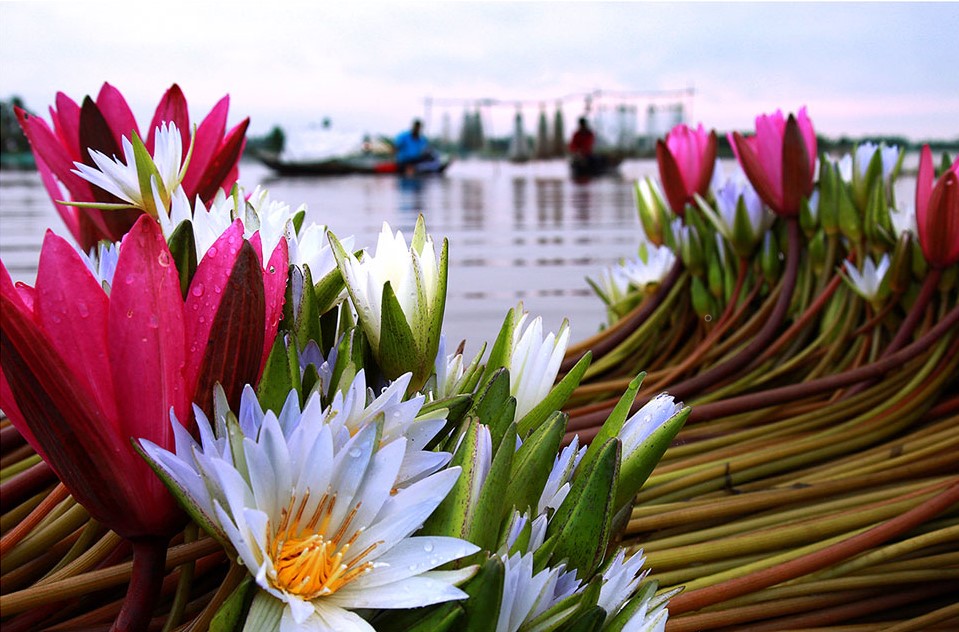 La temporada de nenúfares dura desde principios de septiembre hasta mediados de noviembre, y su cosecha se convierte en un ingreso adicional para los agricultores de la zona durante la temporada anual de inundaciones. Los agricultores cosechan los nenúfaresen sus campos durante todo el día y, después de limpiarlos del lodo, los atan en paquetes que cargan en botes para ser entregados en los mercados.