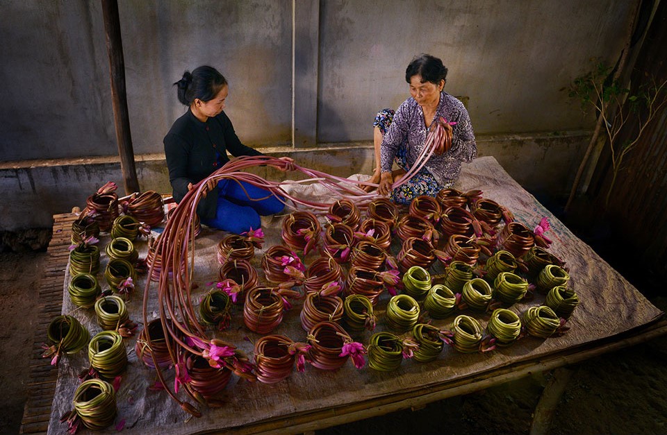 Durante la temporada anual de inundaciones, los residentes del Delta del Mekong, en el suroeste de Vietnam, no solo cosechan las flores de nenúfar para la decoración, sino también su delicioso tallo comestible, que se utiliza para disfrutar de algunas delicias gastronómicas, como la sopa agria de nenúfar.