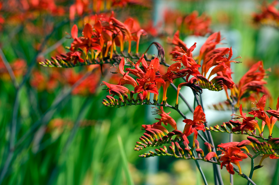 Con grupos apretados de hojas en forma de espada, tallos e inflorescencias parecidas a una cascada de lirios en miniatura, las crocosmias cultivadas en los jardines se convierten elegantes adiciones a las fronteras de herbáceas de verano y otoño.