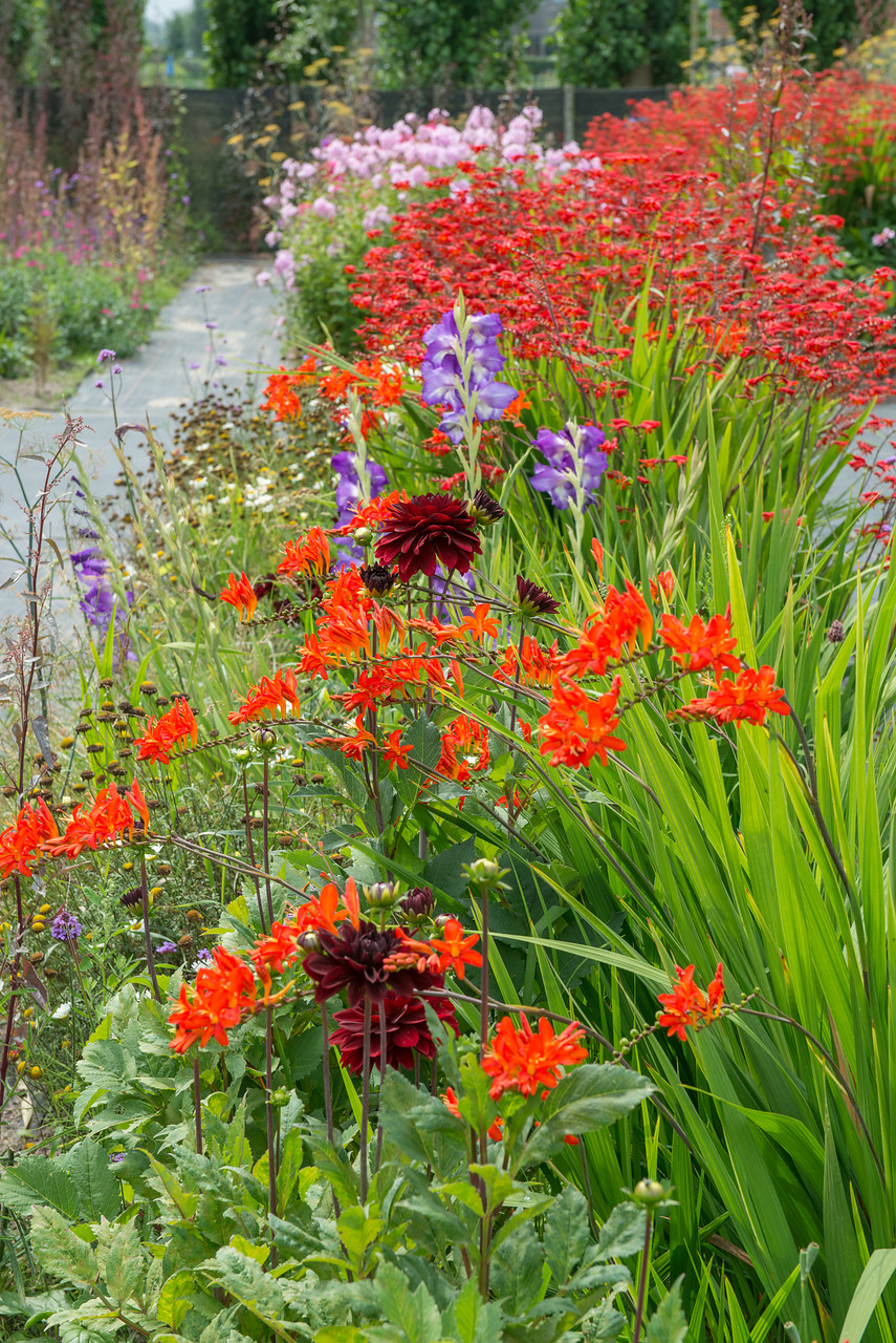 Bordura de herbáceas en verano con Crocosmia • RHS Garden Rosemoor (Hot Garden) • ©RHS/Guy Harrop