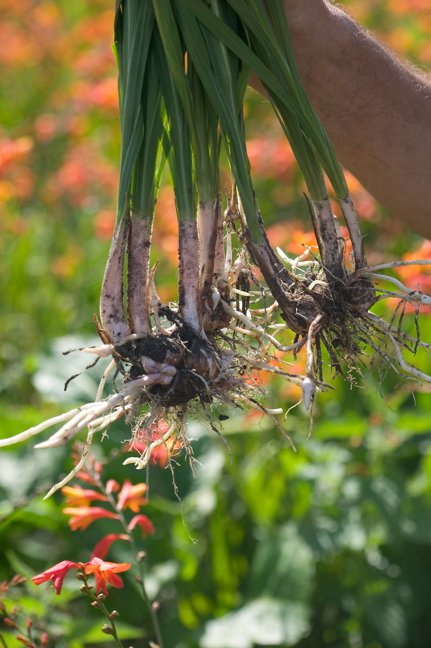 Las crocosmias surgen de grandes cormos subterráneos redondeados que se plantan en primavera y comienzan a florecer a mediados del verano.