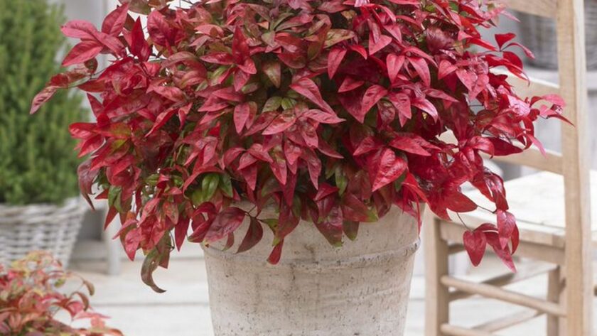 Otra nandina con vistoso follaje en invierno y bajo mantenimiento. En este caso, Nandina domestica ‘Red Light’ es un arbustos perennifolio de crecimiento compacto y tupido, con follaje abigarrado que tiene tonos de rosa, verde y blanco. Puede alcanzar una altura de unos 60 centímetros y se extiende hasta 50 centímetros. Prospera mejor al sol o semisombra en un suelo bien drenado y es resistente hasta a -18ºC