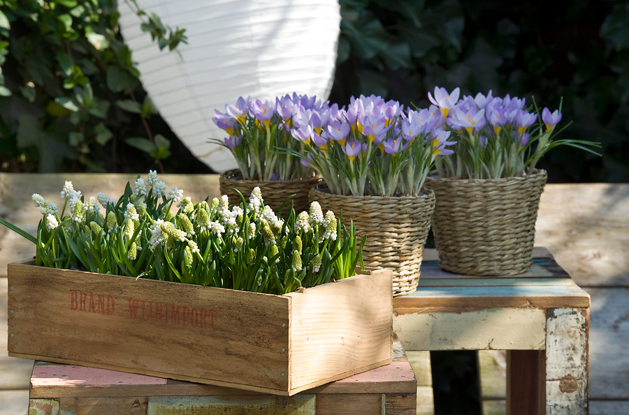 El requisito que no debemos obviar nunca cuando cultivamos bulbos de flor de primavera en maceta es que el contenedor elegido tiene que tener orificios de drenaje en la base. A partir de ahí, el abanico de posibilidad para elegir macetas o contendedores donde plantar los bulbos es grande y todo va a depender de nuestros propios gustos y del lugar donde queremos ubicar el contenedor en primavera, cuando comienzan a florecer.