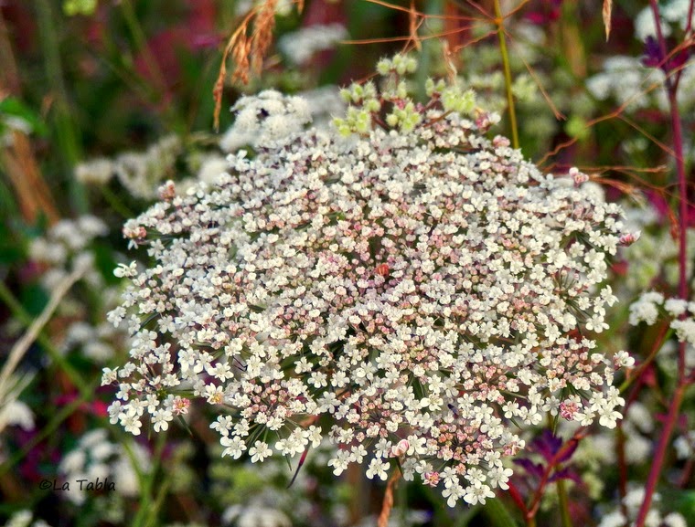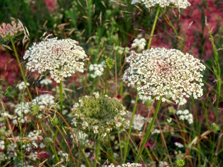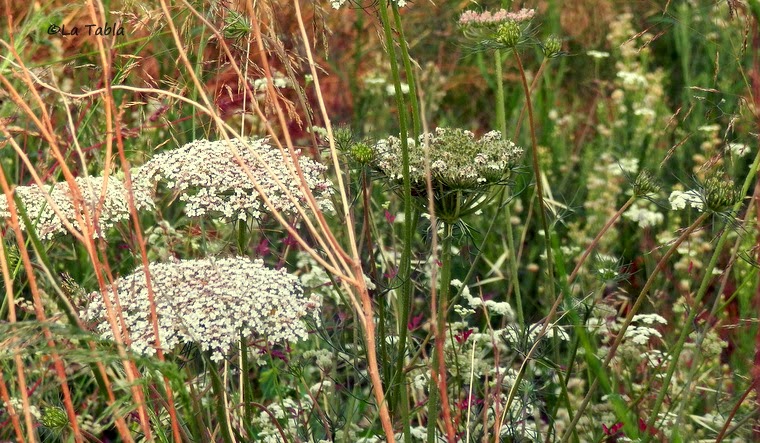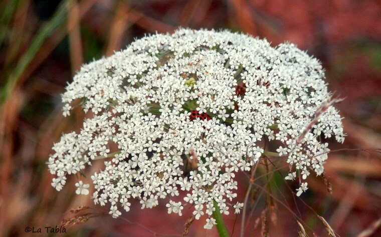 La zanahoria silvestre (Daucus carota) la reina de los campos abandonados, de los bordes del camino, al menos para mí lo es. Considerada como planta ruderal, su vistosa inflorescencia y su altura (hasta 1 metro) le dan un interesante valor ornamental en el jardín. Pero también tiene el mérito de ser el origen de una de las más conocidas hortalizas, la segunda que más se consume después de la patata.