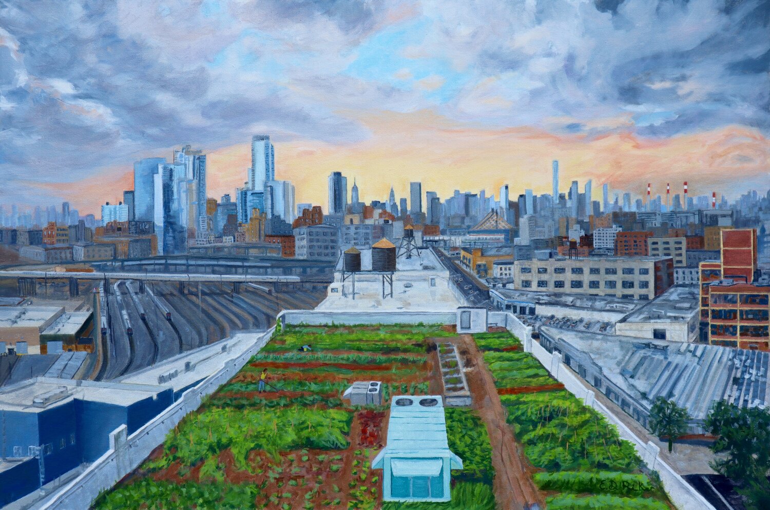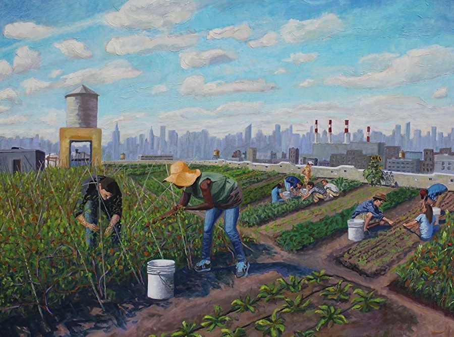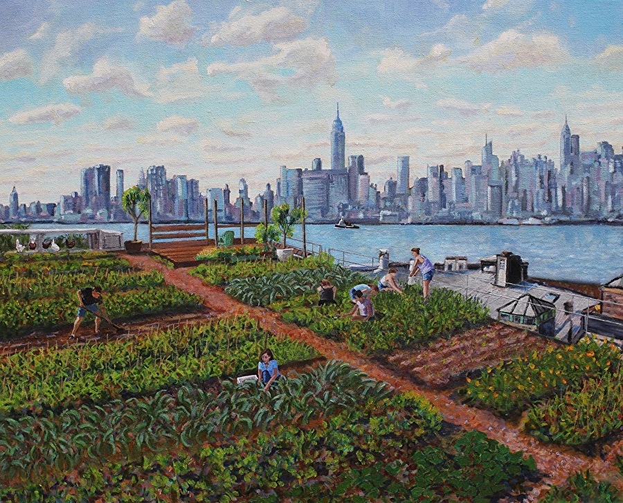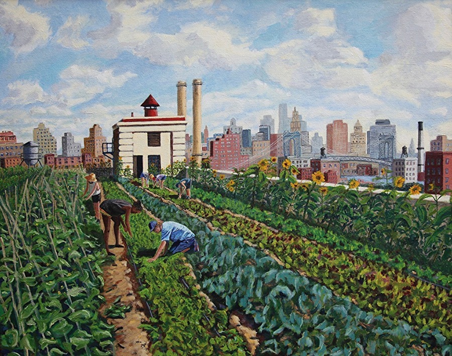| Retrato de la granja en la azotea de Brooklyn Grange, Nueva York | ‘Bird’s-Eye View of Brooklyn Grange-Future’ Elizabeth Downer Riker |