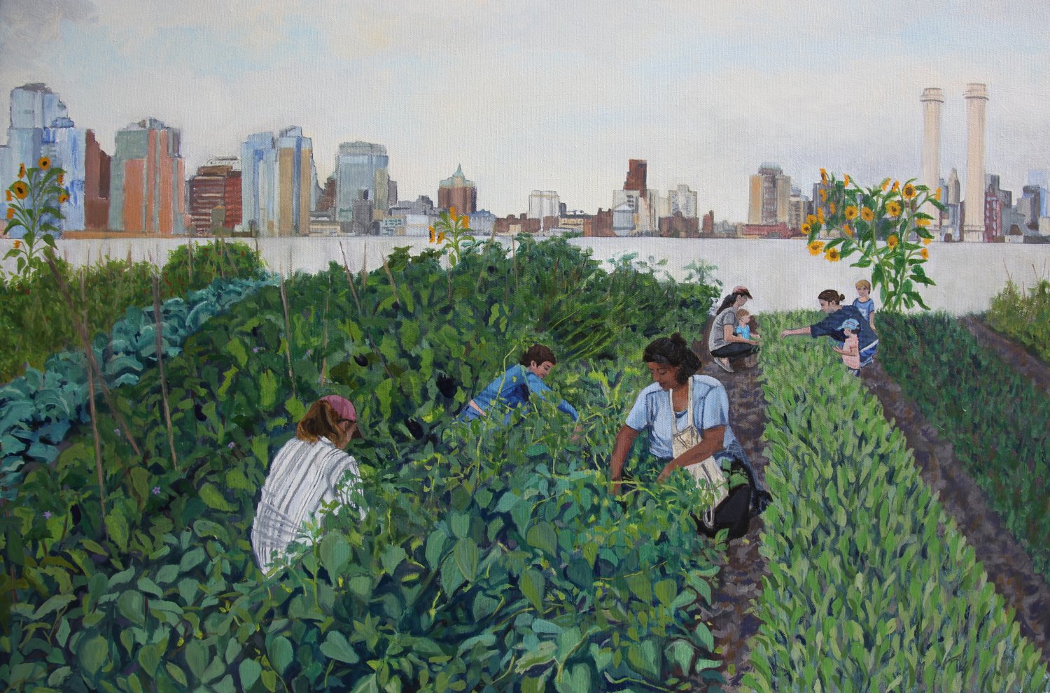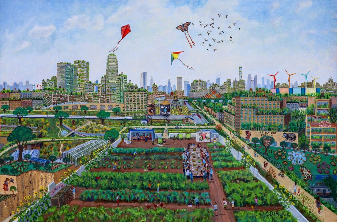 Ahora, Elizabeth Downer Riker documenta una década de jardinería urbana en Re-Enchanting the City, la exposición que reúne una veintena de sus pinturas al óleo, donde presenta su visión futurista de cómo se vería una ciudad «verde».