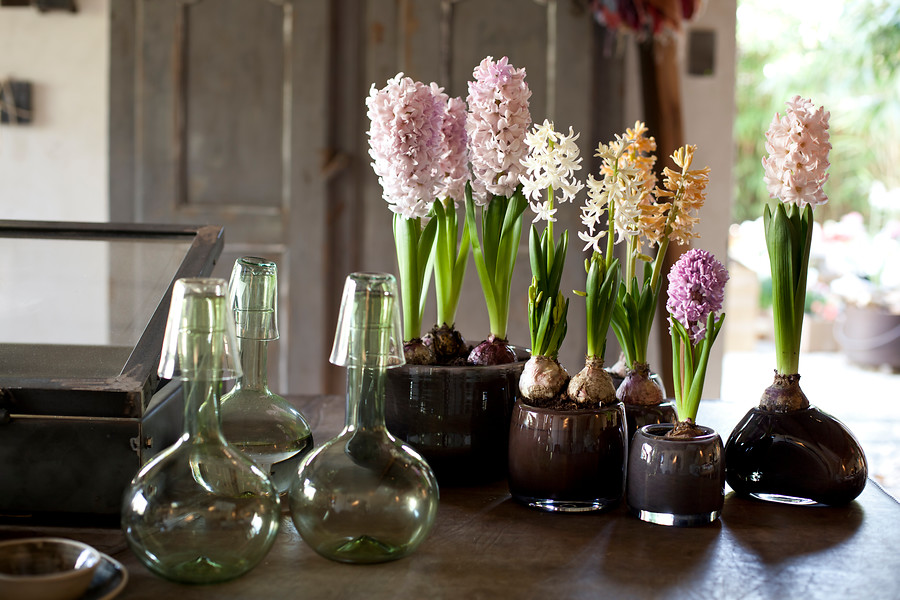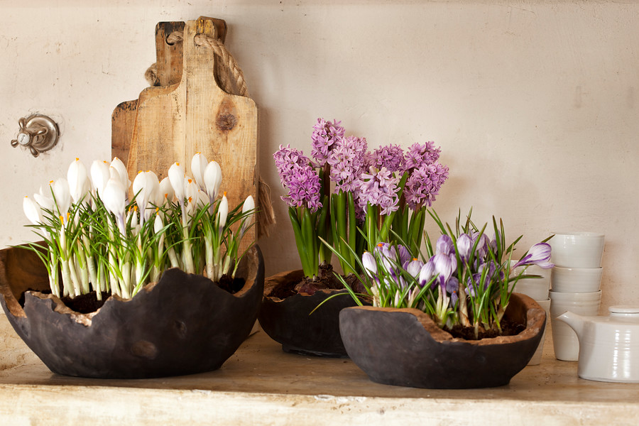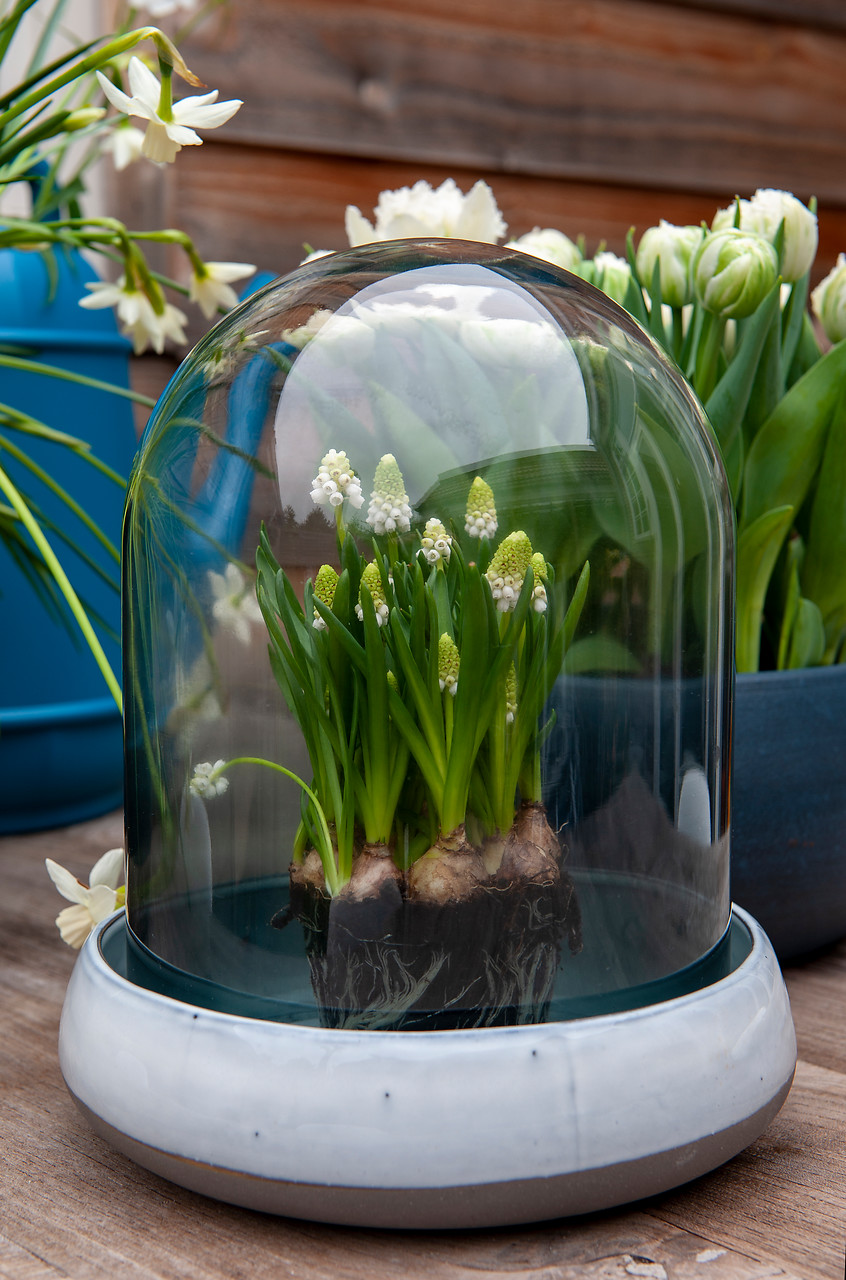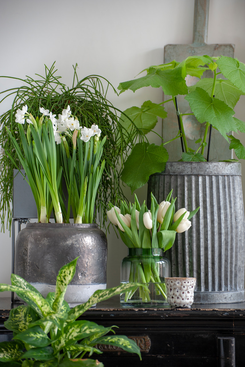 Se pueden crear verdaderos bodegones con flores de tulipanes (Tulipa), narcisos (Narcissus), muscari (Muscari), amarilis (Hippeastrum), las alegres campanillas de primavera (Galanthus) e, incluso, alguna que otra delicada Fritillaria. Pueden ser bulbos forzados disponibles para el interior del hogar o flores de bulbo cortadas. En cualquier caso, el recipiente donde se vayan a exponer marcará la diferencia.
