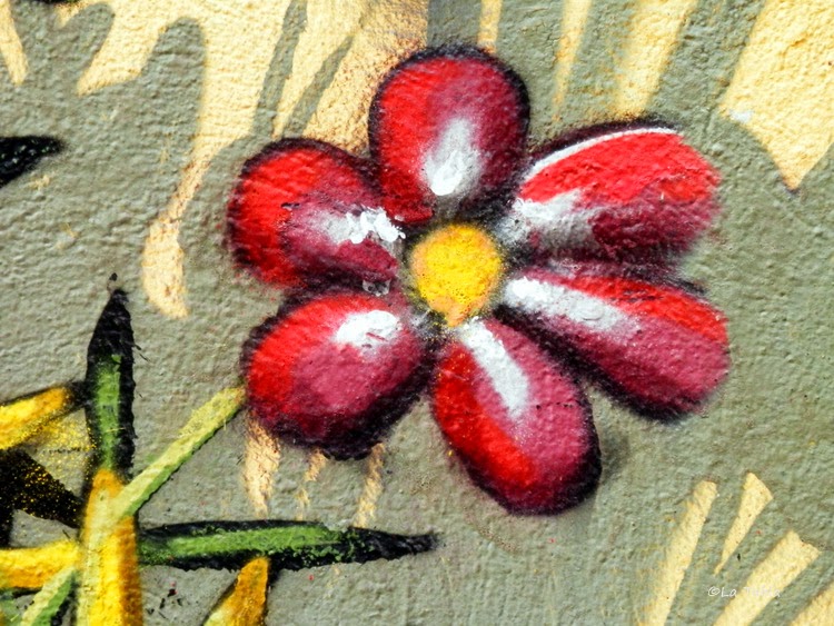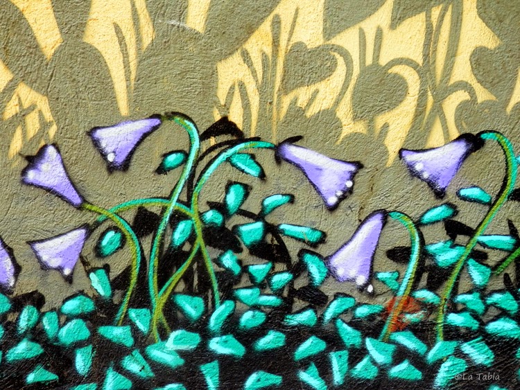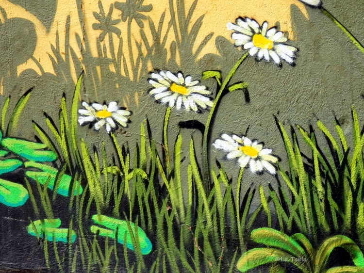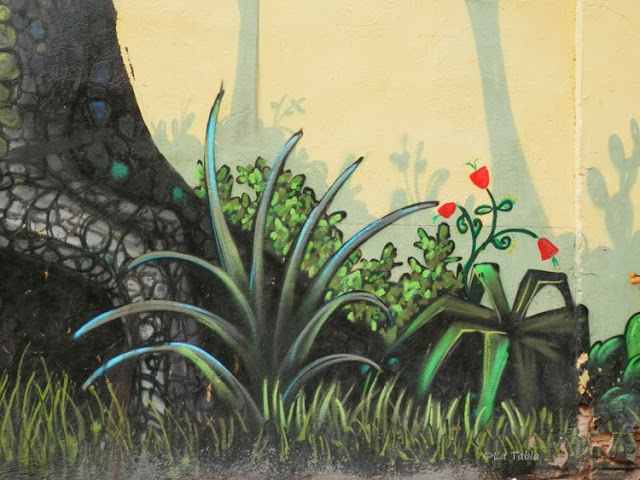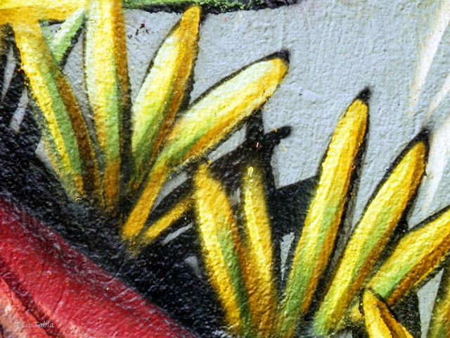 Es realmente saludable aislarse en medio de la ciudad, alejarse sin moverse para mirar lo que tenemos cerca con otra perspectiva. Y digo todo esto porque el otro día, mientras hacía estas fotografías con los sorprendentes detalles de los graffiti del Jardín Botánico de Valencia, pude observar que la mayoría de las personas pasaban de largo ante él. No les llamaba la atención, pero sí les sorprendía verme a mí agachada en mitad de la calle para hacer las fotos. Era entonces, y solo entonces, cuando descubrían al mirar a su izquierda o derecha el inmenso mural. Eso sí, solo se paraban sorprendidos si iban acompañados. Cuando iban solos, simplemente miraban de reojo al tiempo que continuaban el paso.