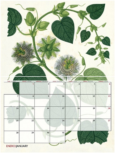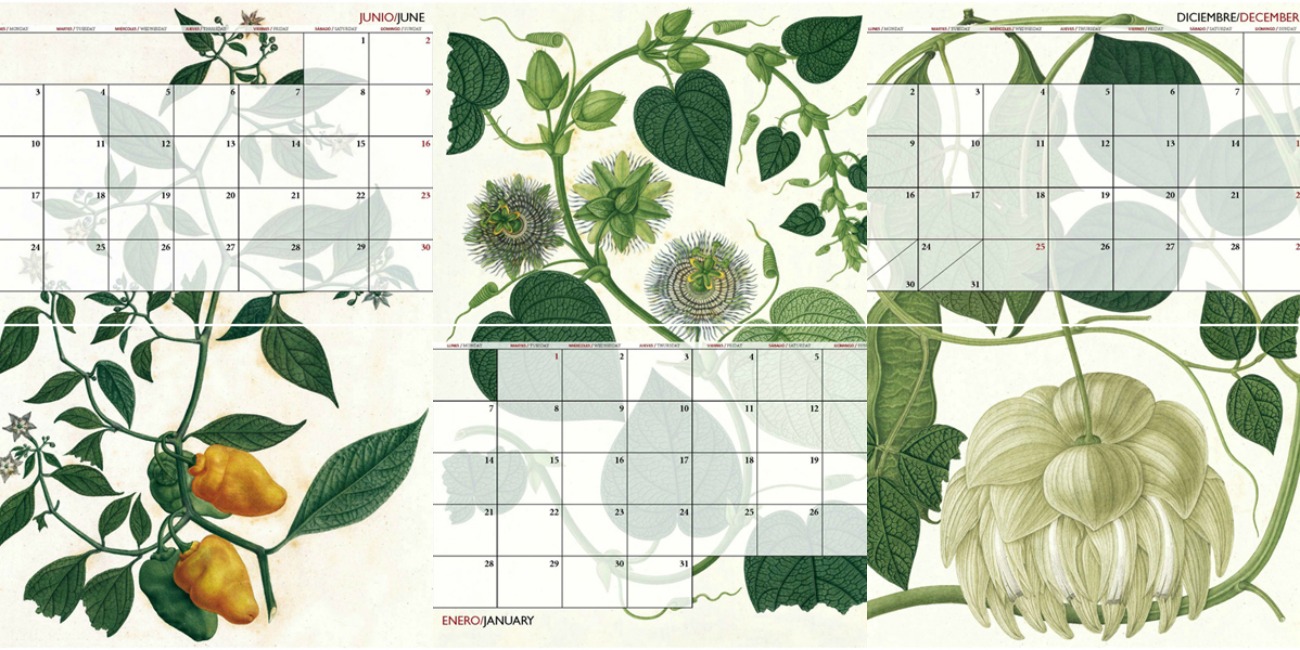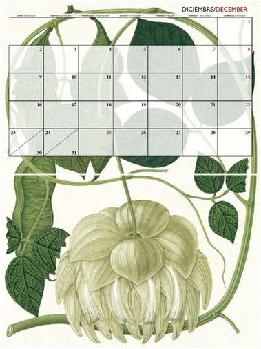 Las ilustraciones de ese calendario nos vuelven a trasladar hasta la Expedición Botánica del Nuevo Reino de Granada dirigida por Mutis. En esta ocasión, nos acercan al “realismo mágico” de esos dibujos botánicos que se conservan intactos, como si el tiempo se hubiera detenido, permitiendo apreciar su belleza en el presente como si nos hubiéramos trasladado al pasado.