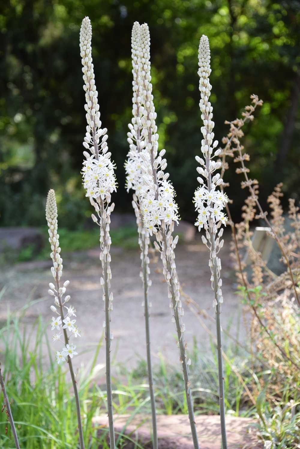 A finales del verano y principios de otoño, después de que las hojas se han extinguido, la inflorescencia emerge como un racimo alto (1-1,5 metros de altura) en forma de espiga, formada por numerosas flores pequeñas y blanquecinas que se abren sucesivamente desde la base, y que tiende a doblarse por el peso de las flores. Aunque las inflorescencias son muy parecidas a las del gamón (Asphodelus spp.), se diferencia en la época de floración, ya que las especies del género Asphodelus florecen en primavera.