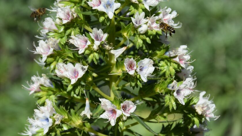 En realidad, desde el punto de vista ornamental, se suelen destacar de esta planta las espléndidas inflorescencias características de otros tajinastes. En este caso, de hasta 40 centímetros, y formadas por racimos de flores blancas con listas azules, azul pálidas, rosadas o moradas, siguiendo la forma helicoidal de las hojas situadas a los extremos de las ramas. Es algo que, en botánica, según he aprendido, se conoce como inflorescencia paniculiforme terminal.