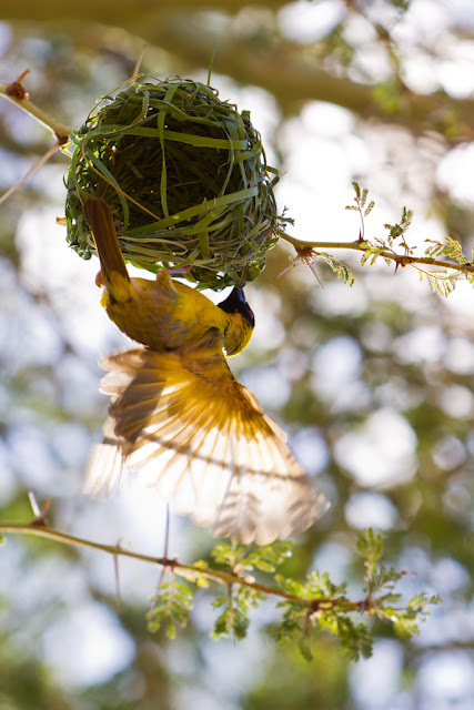 El resultado, nidos extraordinariamente sólidos, algunos a prueba de lluvias, magníficamente diseñados. A medida que avanzan en su construcción, deciden dónde debe ser ensanchado, curvado o engrosado. Colgados de esa estructura, desde el interior y hacia afuera, tejen las paredes de arriba hacia abajo, cruzando las fibras con el pico.