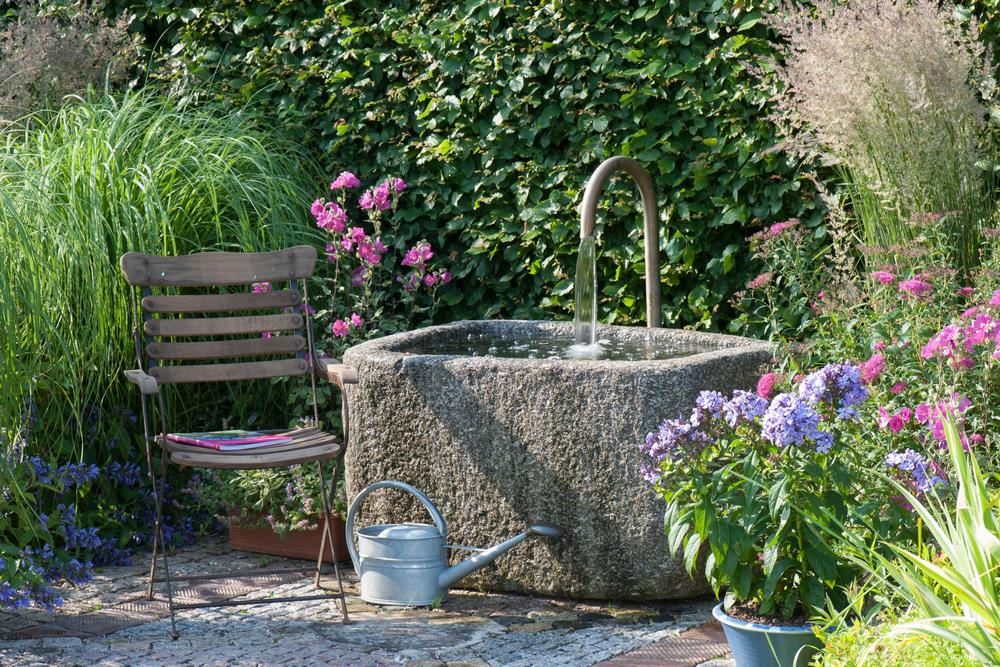 En algunos casos, cuando se trata de diseños con aire rústico, la opción pasa por bebederos hechos de piedra o, en ocasiones, recuperados, lo que eleva su valor ornamental.