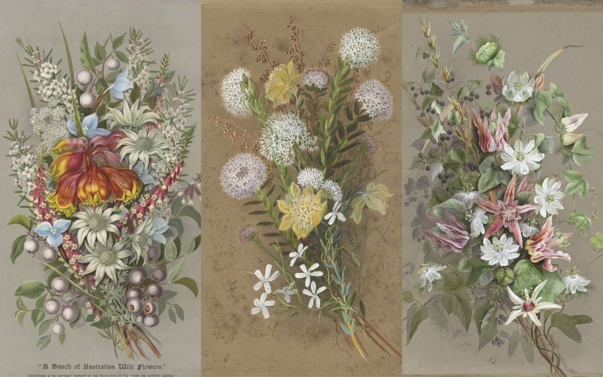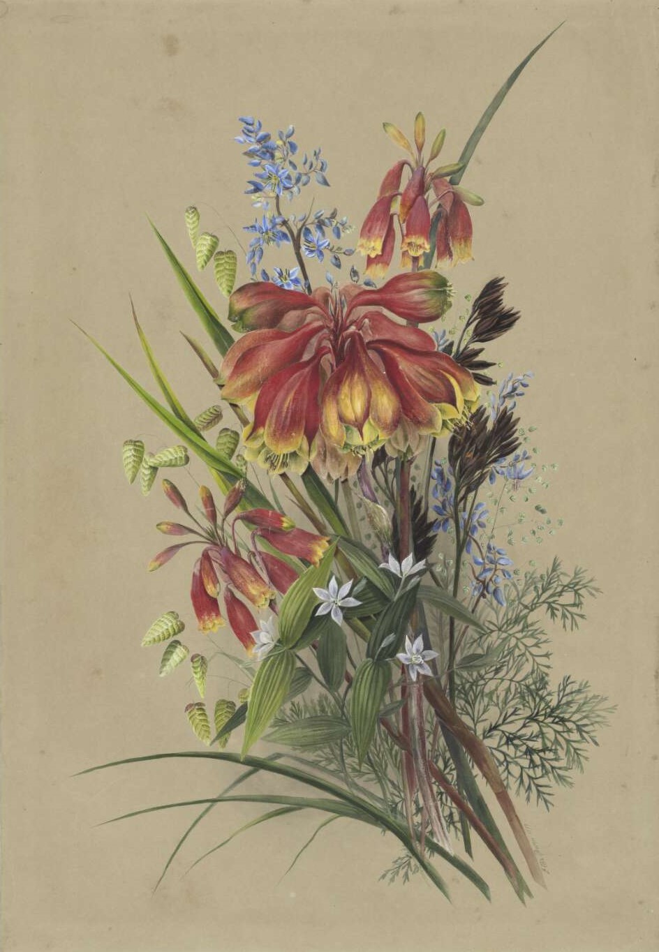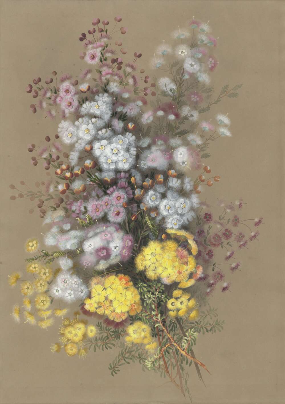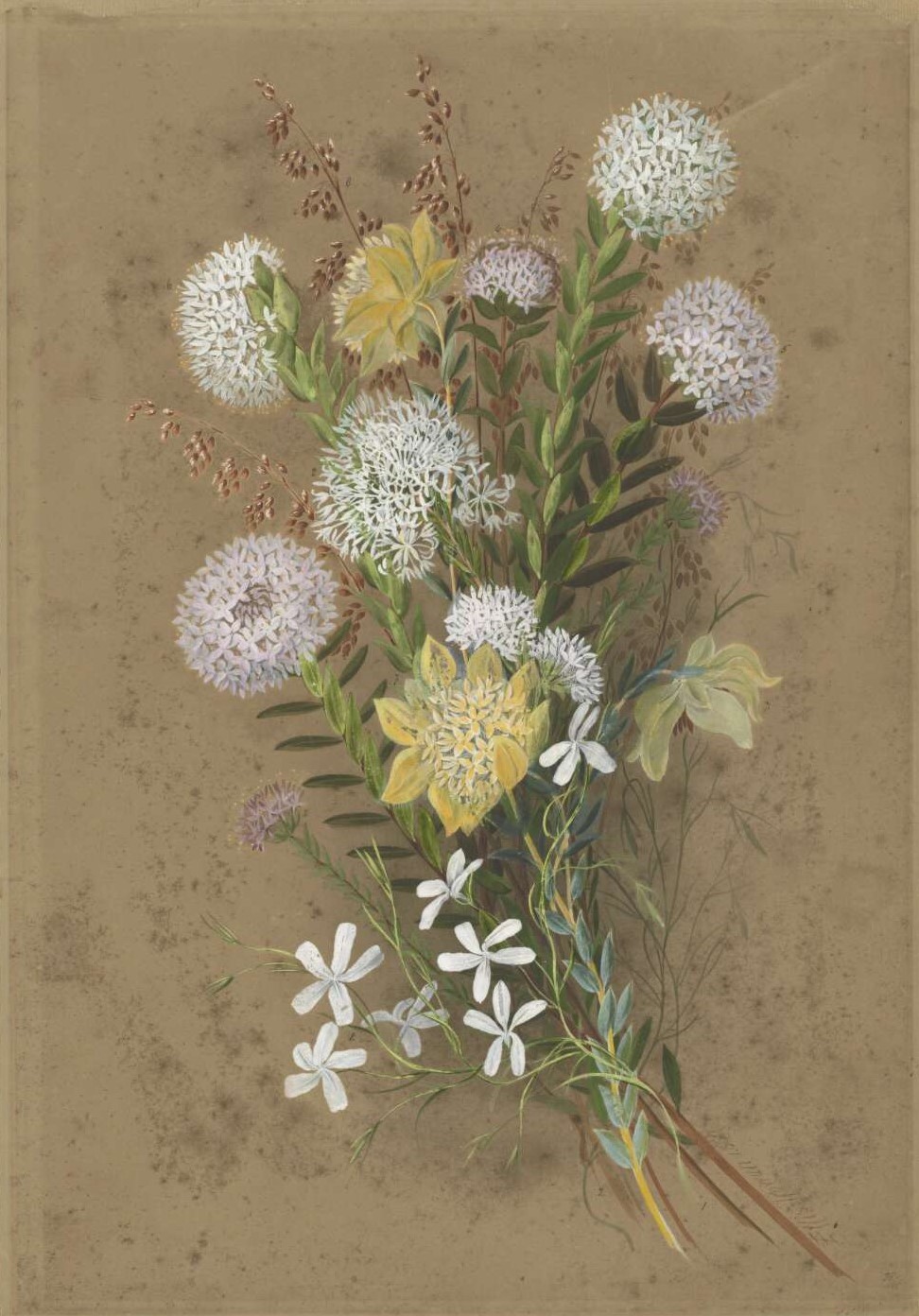 Esas composiciones son las que me han interesado especialmente y he querido reunir una selección de manojos o ramos, incluso un arreglo floral, que considero puedo ser representativa para conocer esa interesante y prolífica serie de acuarelas de grupos de plantas dispuestos en ramilletes. Digamos que, como ella, me he dejado llevar por criterios estéticos, aunque también por la curiosidad de descubrir algunas de las fascinantes especies endémicas que conforman la flora de Australia.
