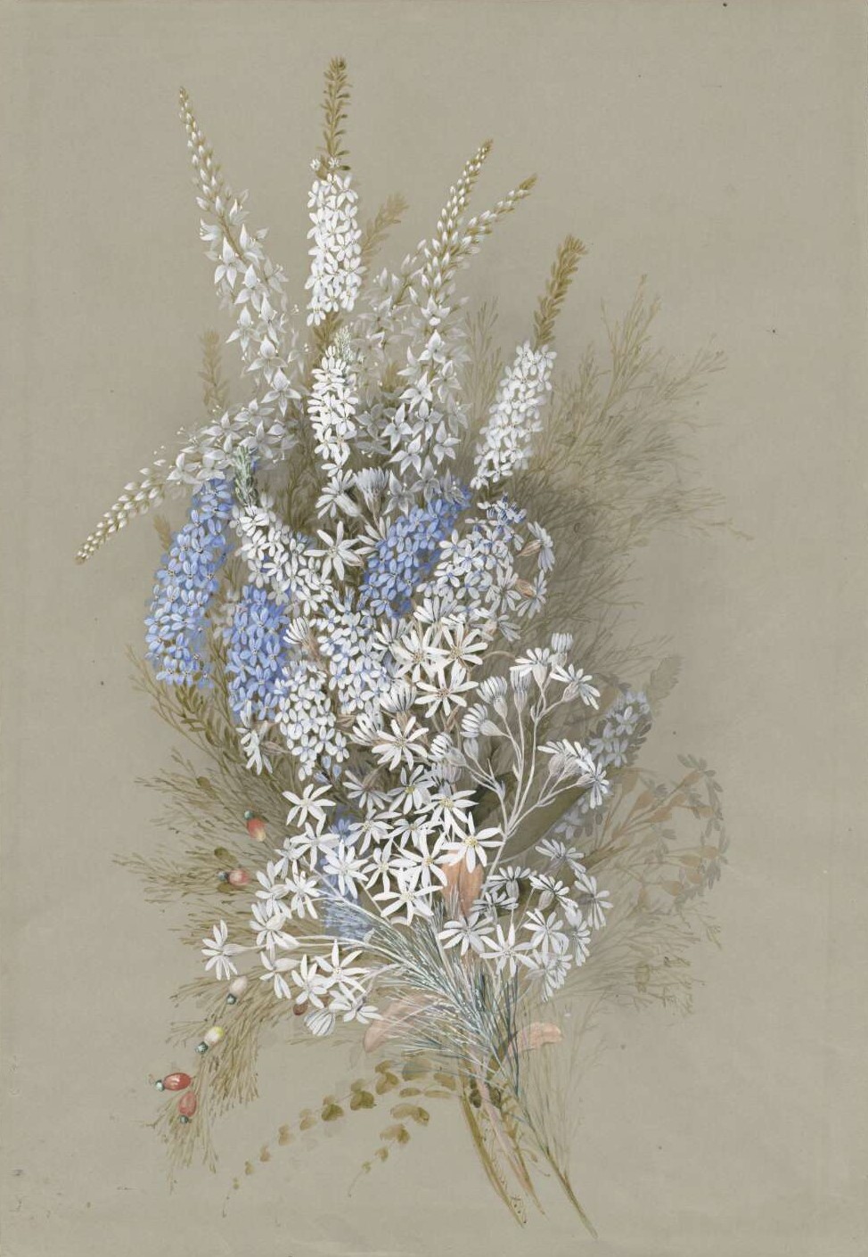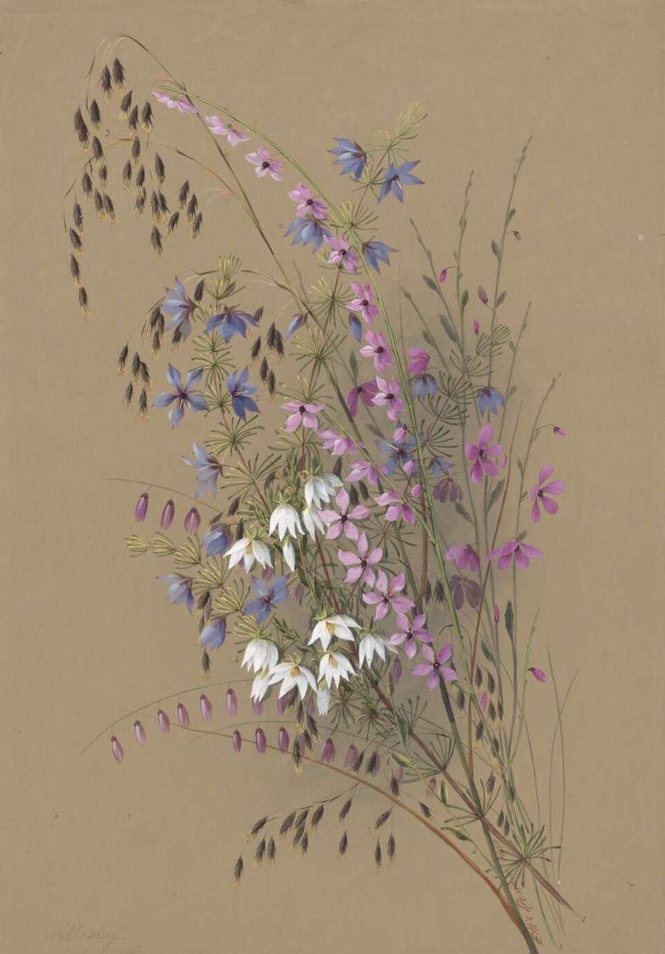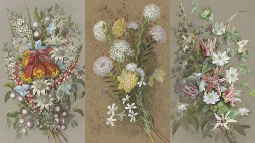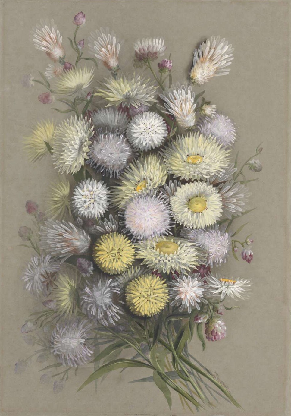 Esas composiciones son las que me han interesado especialmente y he querido reunir una selección de manojos o ramos, incluso un arreglo floral, que considero puedo ser representativa para conocer esa interesante y prolífica serie de acuarelas de grupos de plantas dispuestos en ramilletes. Digamos que, como ella, me he dejado llevar por criterios estéticos, aunque también por la curiosidad de descubrir algunas de las fascinantes especies endémicas que conforman la flora de Australia.