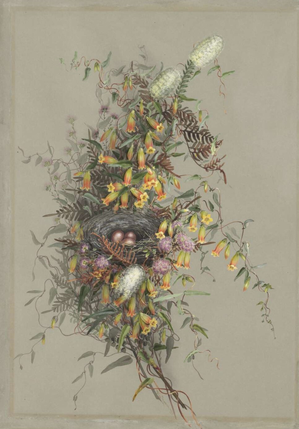 | Marianthus bignoniaceus, Kunzea parvifolia, Melaleuca squarrosa, and a stylised bird’s nest. Victoria 1886 | Ellis Rowan |