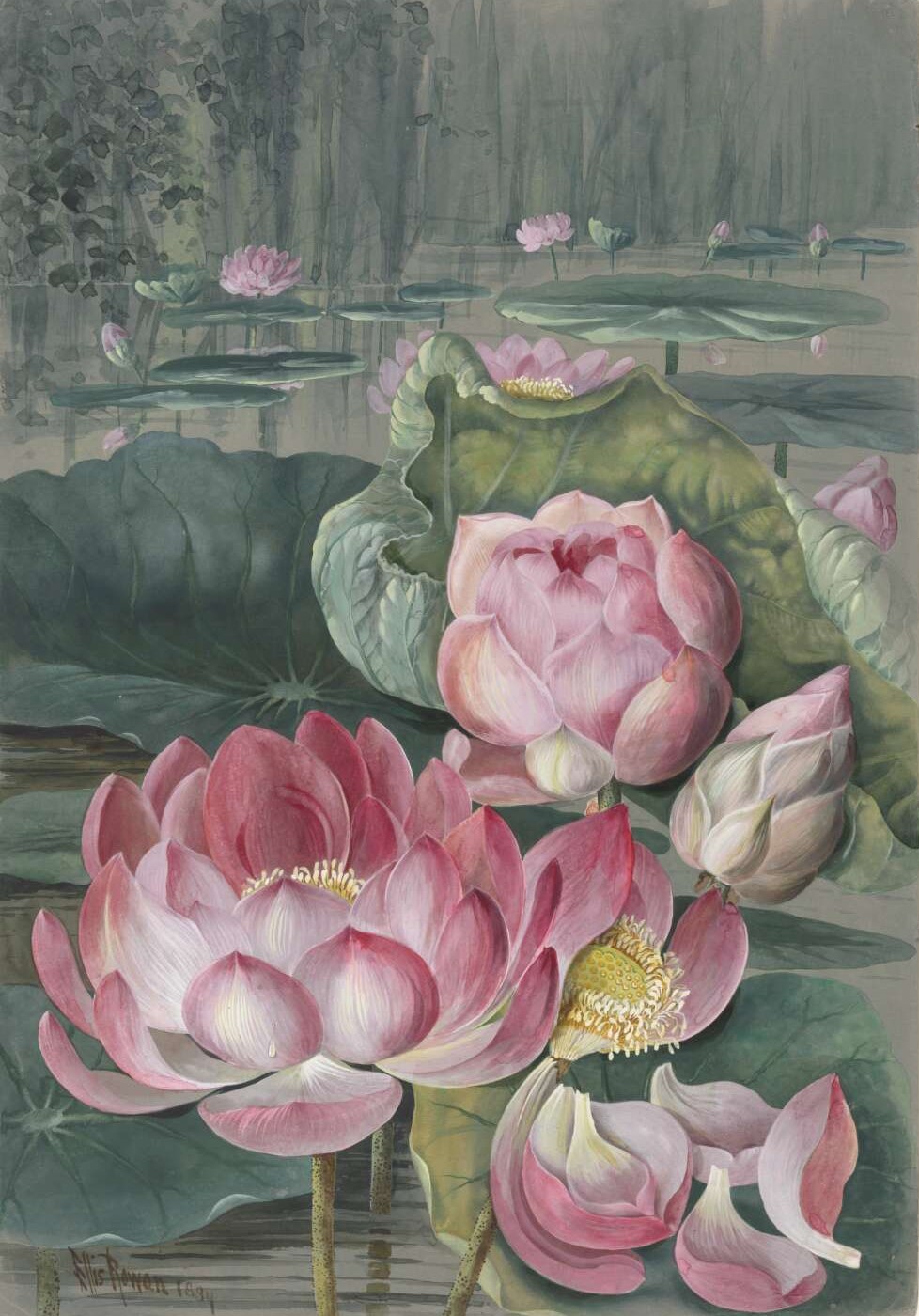Se la suele considerar como una pintora rápida y directa, que no tenía intención de ser una ilustradora botánica en el sentido estricto. También se dice que su composición fue influenciada por la obra Temple of Flora o el Jardín de la Naturaleza de Robert John Thornton, formado por una serie de lustraciones de flores exóticas en entornos naturales, fruto de la apasionada, algunos creen que casi obsesiva, veneración personal y científica de Thornton por Carlos Linneo.