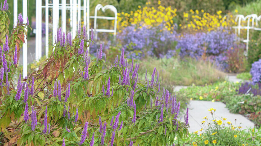 No menos atractivas que las hojas son sus inflorescencias, que se presentan en largas y estrechas panículas, cargadas de pequeñas flores tubulares de color rosa violeta que son atractivas para las abejas melíferas. Lo mejor de todo es que surgen desde agosto hasta octubre, una floración tardía acompañada de colores otoñales que combina muy bien con vivaces y otras plantas perennes, como las flores de ásteres de otoño y algunas salvias arbustivas.