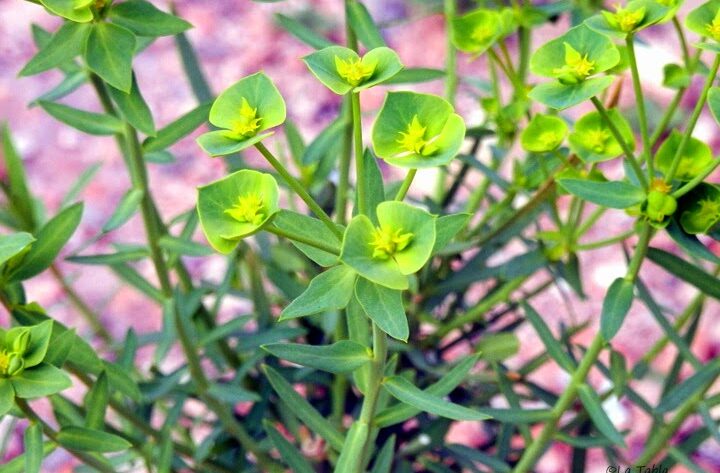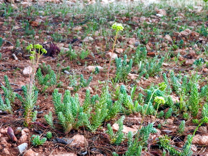 Descubres el primer brote de un algarrobo o un pino; del lentisco o coscoja; de romero, oregano o ruda; sedum por todas partes; hierbas con bellas y diminutas flores y, cómo no, las “alóctonas más autóctonas” de la zona, chumberas y opuntias brotando junto a las plantas madre que crecen junto al lentisco y la coscoja, bien pegados todos, como si estuvieran diciendo: a ver quién es más de esta tierra; o esas diminutas flores que cuando te acercas crecen y se hacen inmensamente bellas. También hay combos, mas bien, agrupaciones al pie de un pino, por ejemplo, compitiendo por esa sombra que hace la vida un poco más saludable incluso para esas plantas tan mediterráneas y amantes del sol. Las que no quieren sombra, tienen todo el terreno para ellas, ahora salgo aquí y después allí. Así, te muevas en la dirección que te muevas siempre encuentras alguna recompensa. Poneros cómodos ¡que hay muchas!