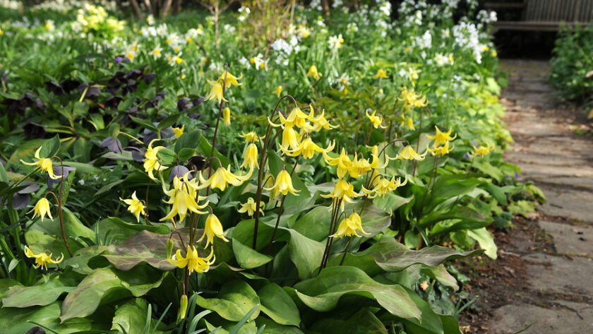Erythronium es un género de plantas bulbosas que producen largos tallos con flores solitarias inclinadas de color amarillo, blanco y rosa en primavera.