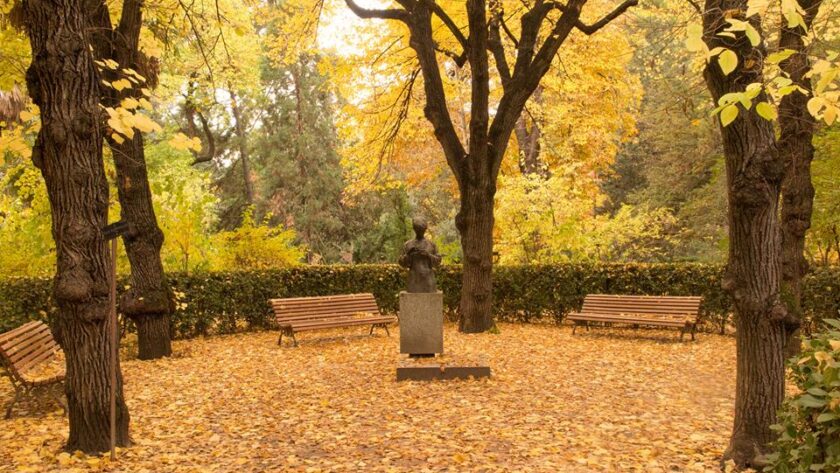 Pero volvemos a la escultura de esta imagen, cuyo detalle podemos apreciar en la otra foto (maravillosa también). En el centro de una glorieta rodeada de tilos y dedicada a los Jardines por la Paz, la Glorieta de la Niña, existe una estatua realizada por el escultor Julio López Hernández en 1991. Para esa estatua, ahora llamada “La Niña”, fue precisamente una de sus dos hijas, Marcela, quien sirvió de modelo. Julio López Hernández (Madrid, 1930) en sus comienzos se dedicó a la escultura religiosa, pero pronto se especializó en la llamada nueva figuración y fue uno de los miembros fundadores del llamado Realismo Madrileño.