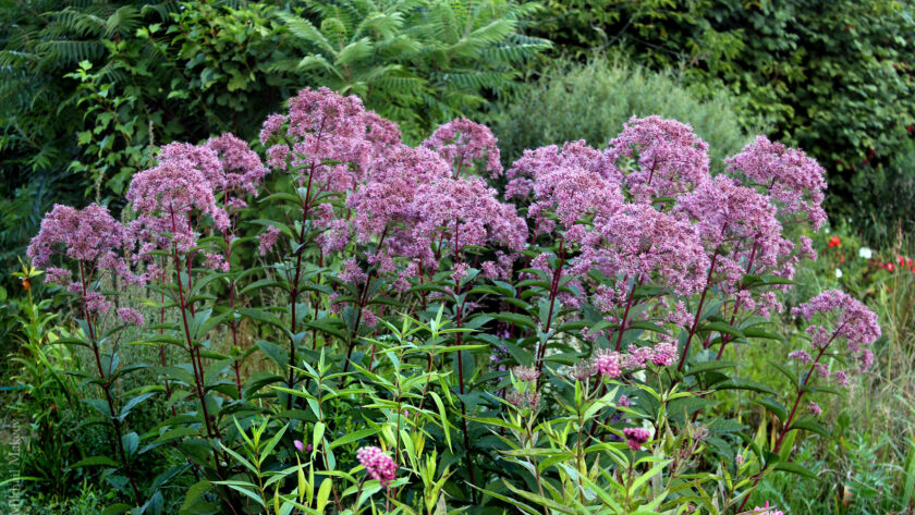 Eupatorium maculatum (Atropurpureum Group) ‘Purple Blush’ fue criado por Piet Oudolf de Holanda. Tiene flores de color rosa oscuro de julio a septiembre en tallos de 1,5 metros de altura.