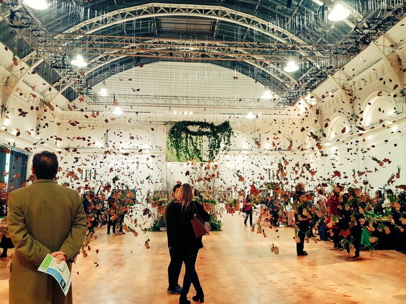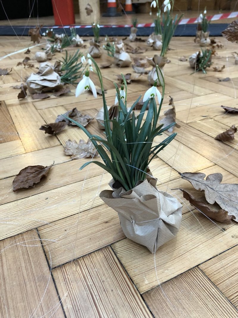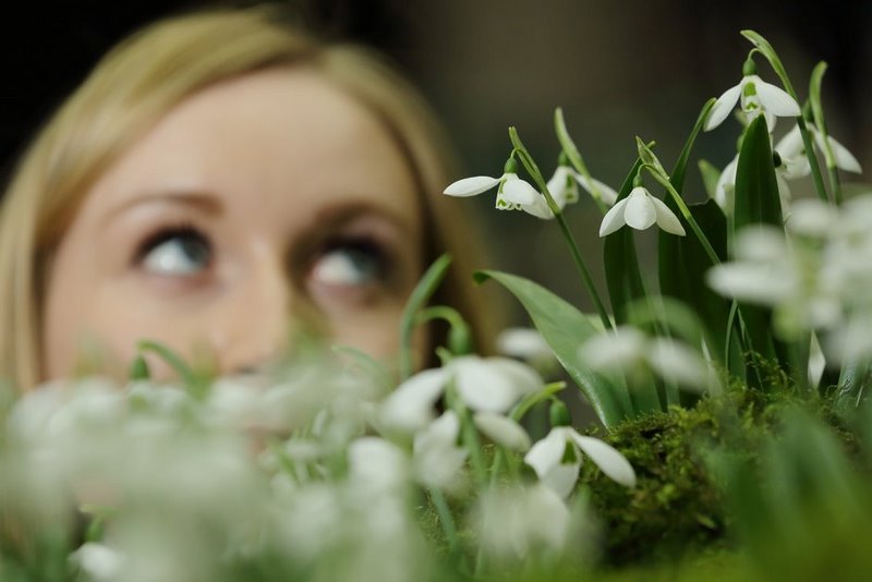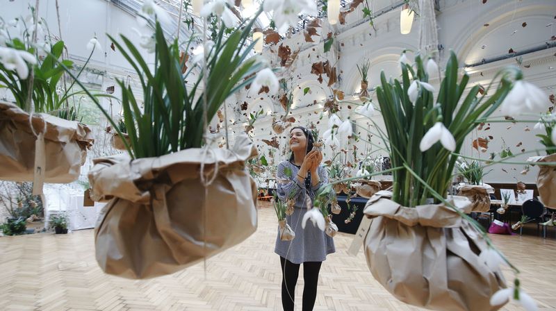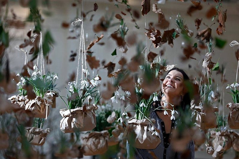 La transición entre el invierno y la primavera ya se anuncia. Es la primera instalación de arte floral en Lindley Hall, Westminster, Londres, donde la Royal Horticultural Society (RHS) celebra anualmente la feria de plantas Early Spring Plant Fair. En esta ocasión, uno de los atractivos lo forman las campanillas de invierno snowdrops (Galanthus), que anuncian la llegada de la primavera y lo hacen colgando desde el cielo de ese gran salón.