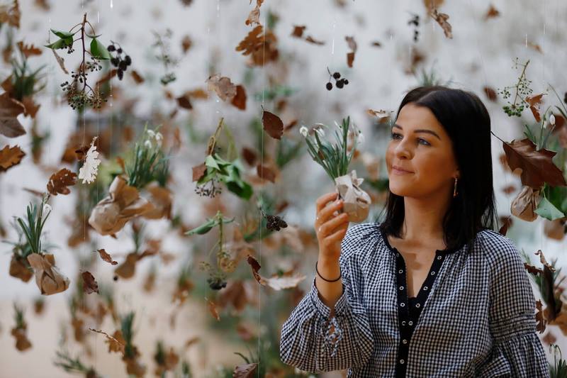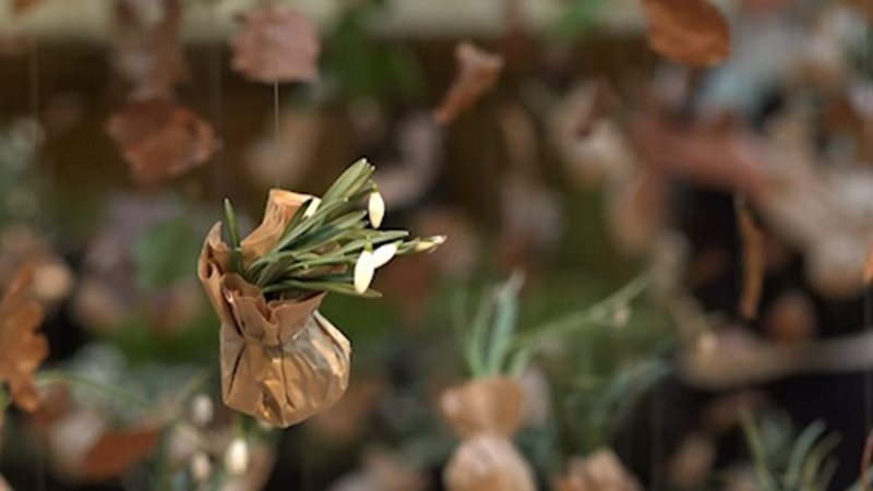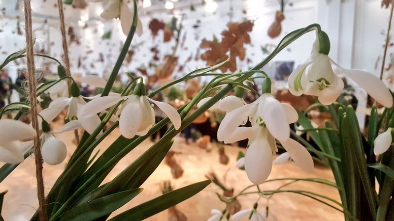 El efecto llamada de esta feria lo ha proporcionado una instalación de campanillas de invierno o snowdrops (Galanthus spp) realizada por la diseñadora de jardines británica Fiona Silk, donde se presentan las plantas envueltas en papel de estraza y suspendidas del techo.