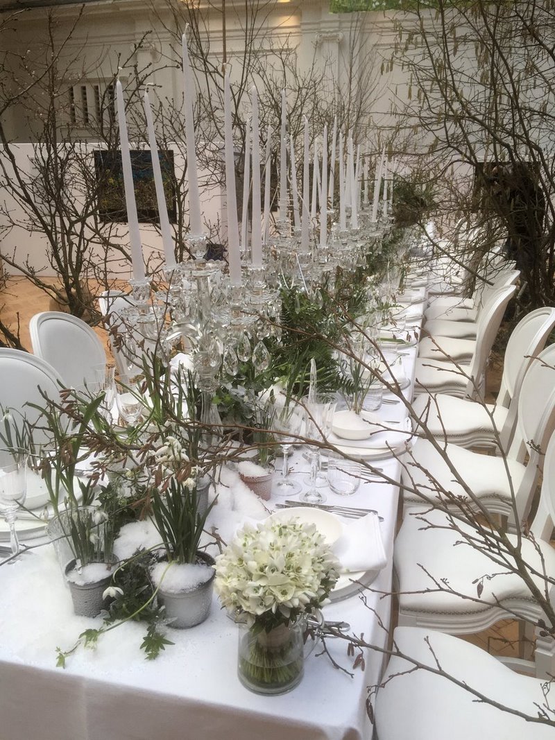 Junto a las plantas que anuncian la cercanía de la primavera y sus diferentes presentaciones, me gustaría detenerme en el trabajo realizado por Zita Elze. Se trata, según explica ella misma, de una instalación donde celebra la transición natural del invierno a la primavera, con una escena inspirada en el bosque, velada por la última nieve suave de la temporada. Entre los árboles y rodeado de miles de campanillas frescas (Galanthus nivalis), espera una mesa de banquetes, vestida de blanco y brillando con cristal transparente y las flores delicadas de cientos de campanillas de nieve (Leucojum Aestivum). Una escena poética para invitar a los visitantes a sentir la transición del invierno hacia la primavera.