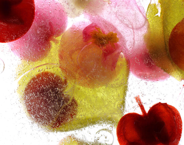 Para conseguirlo, seleccionó materiales vegetales transparentes y de colores vivos. Una vez congelados, los colocó en una caja muy ligera de forma que la luz posterior permitiera ver el objeto y su color al detalle. Por supuesto, el trabajo lo tuvo que hacer con rapidez porque los focos derretían los bloques de hielo.