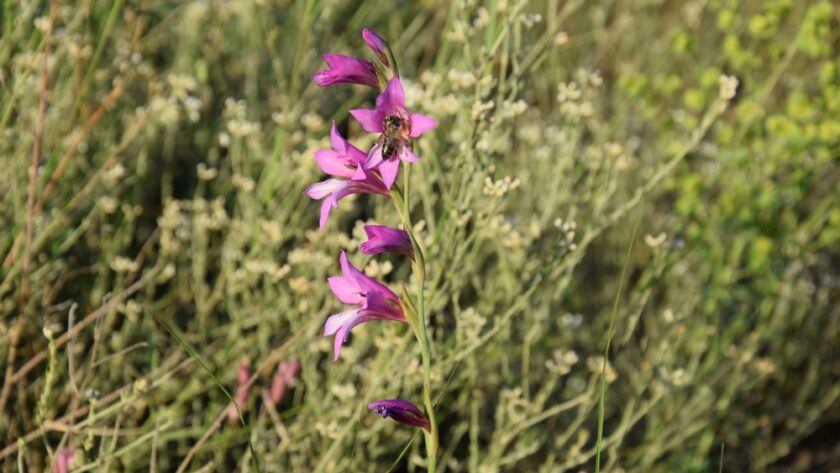 Mis flores favoritas este año son las de los gladiolos (Gladiolusillyricus), plantas que por esta zona asoman muy tímidamente, siempre en segunda línea, pero si caminas con atención es imposible que pasen desapercibidas sus flores, ya que a veces cogen cierta altura , como si quisieran llamar tu atención. No sucede lo mismo con las flores rosa intenso de Centaurium quadrifolium, una planta de poca altura y siempre creciendo entre piedras, pero situada en primera línea, sin esconderse, para capturar bien la luz … y tu mirada.