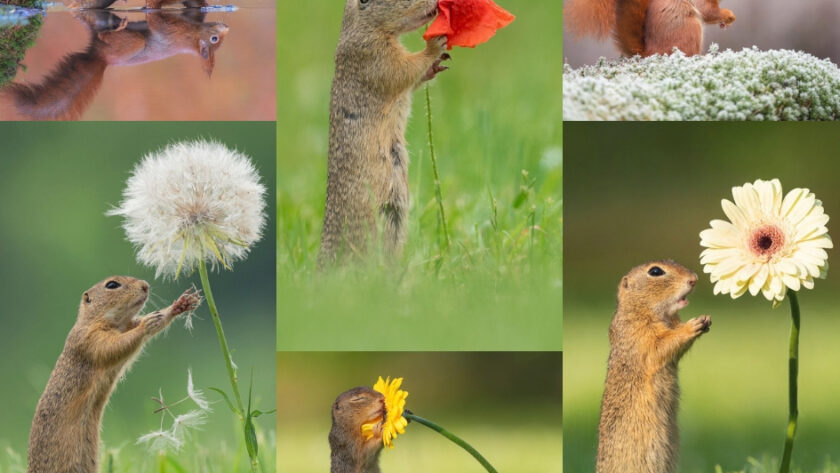 Lo cierto es que las imágenes que ha logrado capturar de esas ardillas de tierra son excelentes y llamativas, aunque no se viralicen de igual modo. Por eso, hoy, he querido compartir una serie de fotos con ardillas y margaritas, pero, también, con una flor de amapola, un diente de león y, cómo no, con alguna que otra nuez. Fotos de ardillas caminando por el agua… y de algún que otro búho real (Bubo bubo) mirando fijamente y muy asombrado… o eso parece.