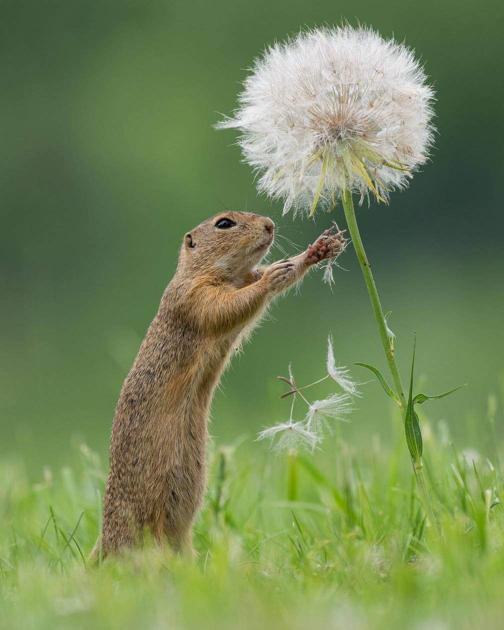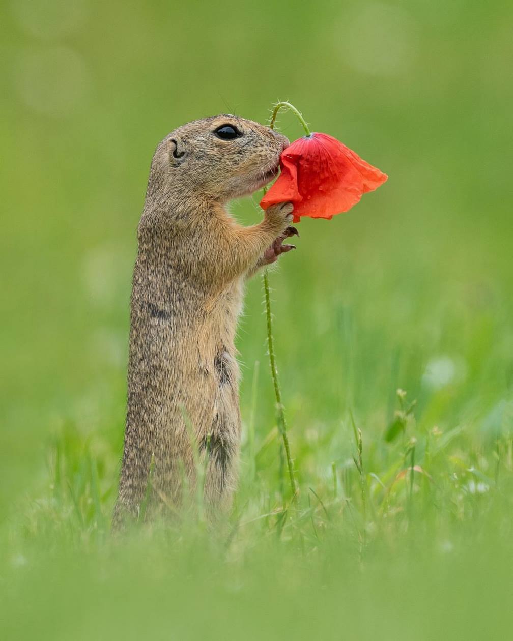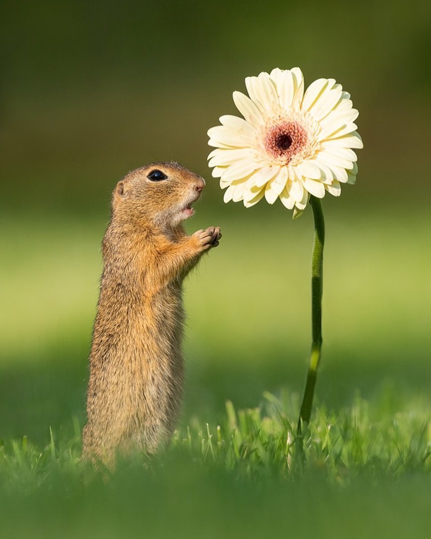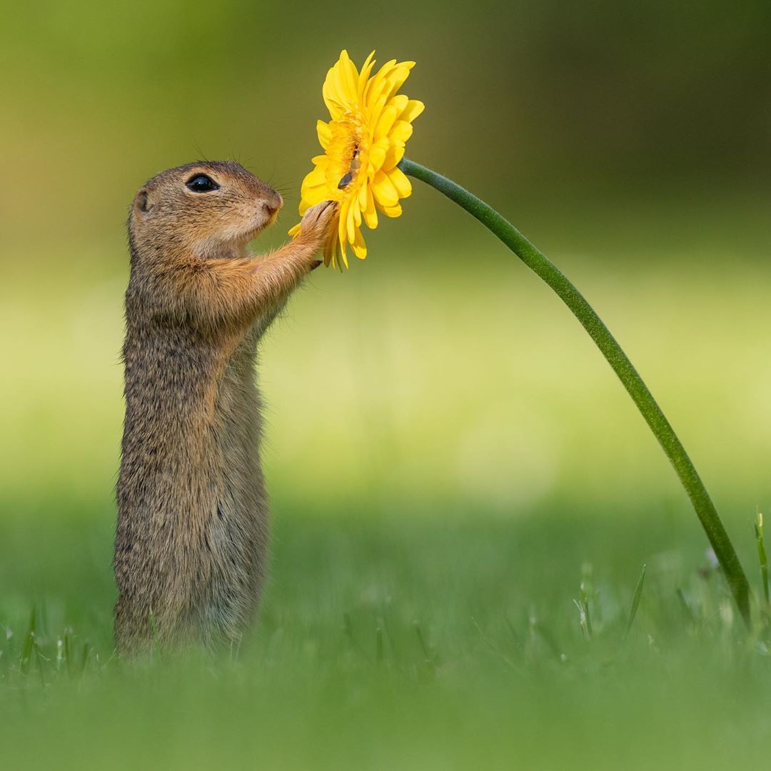 La imagen de una ardilla de tierra olisqueando una margarita amarillase ha convertido en una foto viral estos días. Un episodio que le costó a Dick van Duijn dos horas y aproximadamente 200 fotografías para lograr, finalmente, capturar un mágico momento, y todo, antes de que la ardilla en cuestión se inclinara para dar un sabroso bocado a la flor… Pero esa parte mejor la ignoramos, para quedarnos con la versión romántica de la escena. Claro que, el autor de esta fotografía tiene otros tesoros, no menos mágicos, que pueden apreciarse en su cuenta de Instagram.
