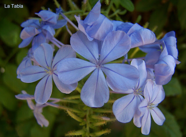 El Plumbago auriculata o capensis, también conocido como Celestina, Jazmín del cielo, Jazmín celeste y … suma y sigue en celeste. Durante casi todo el año, regala sus azuladas flores, de cinco pétalos y, si está bien arraigado, este arbusto trepador resiste bien la sequía. Azul cielo con los matices de los rayos de sol que la iluminan.