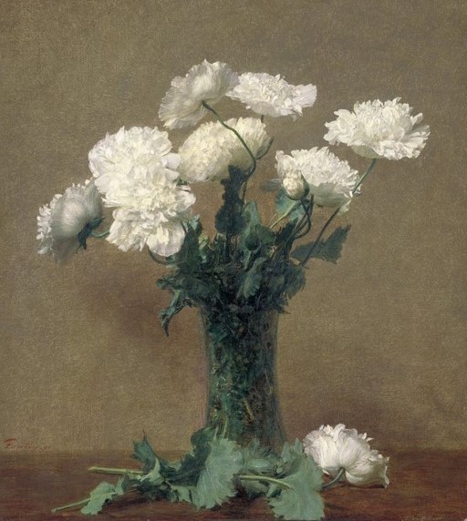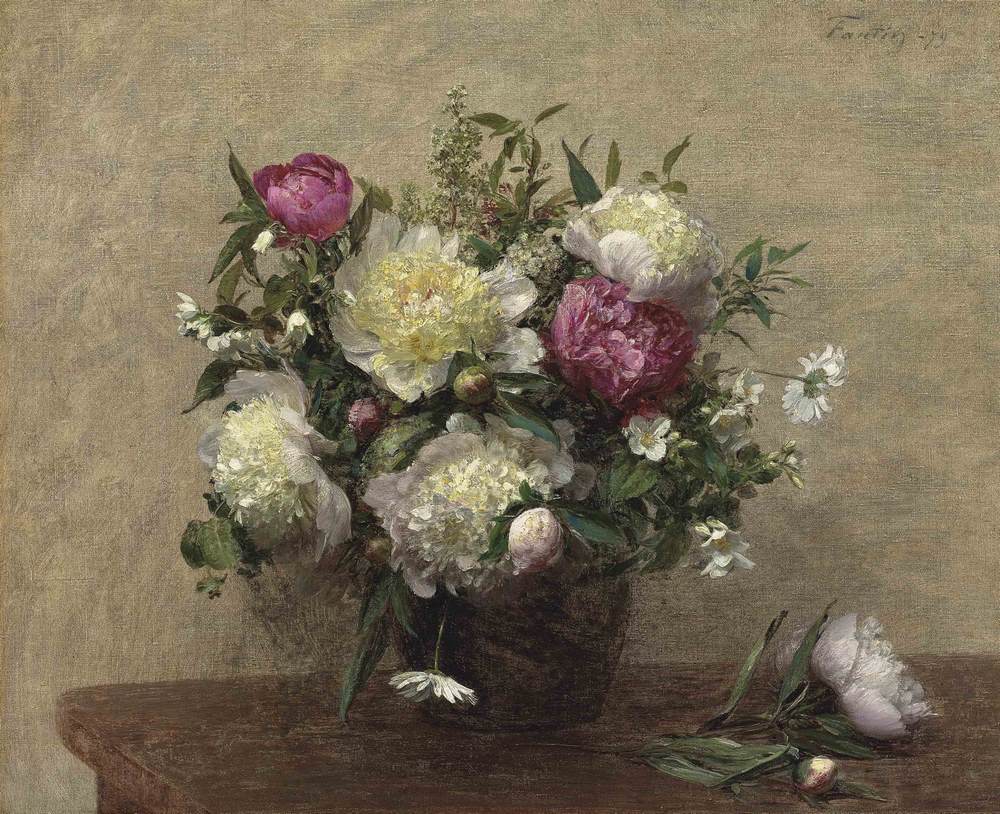 Henri Fantin-Latour componía ramos que luego pintaba sobre fondos neutros en la intimidad del taller, convirtiendo las flores de su jardín en el principal motivo de sus obras, con bodegones florales de extraordinario realismo que alcanzaron gran fama y un enorme éxito comercial.