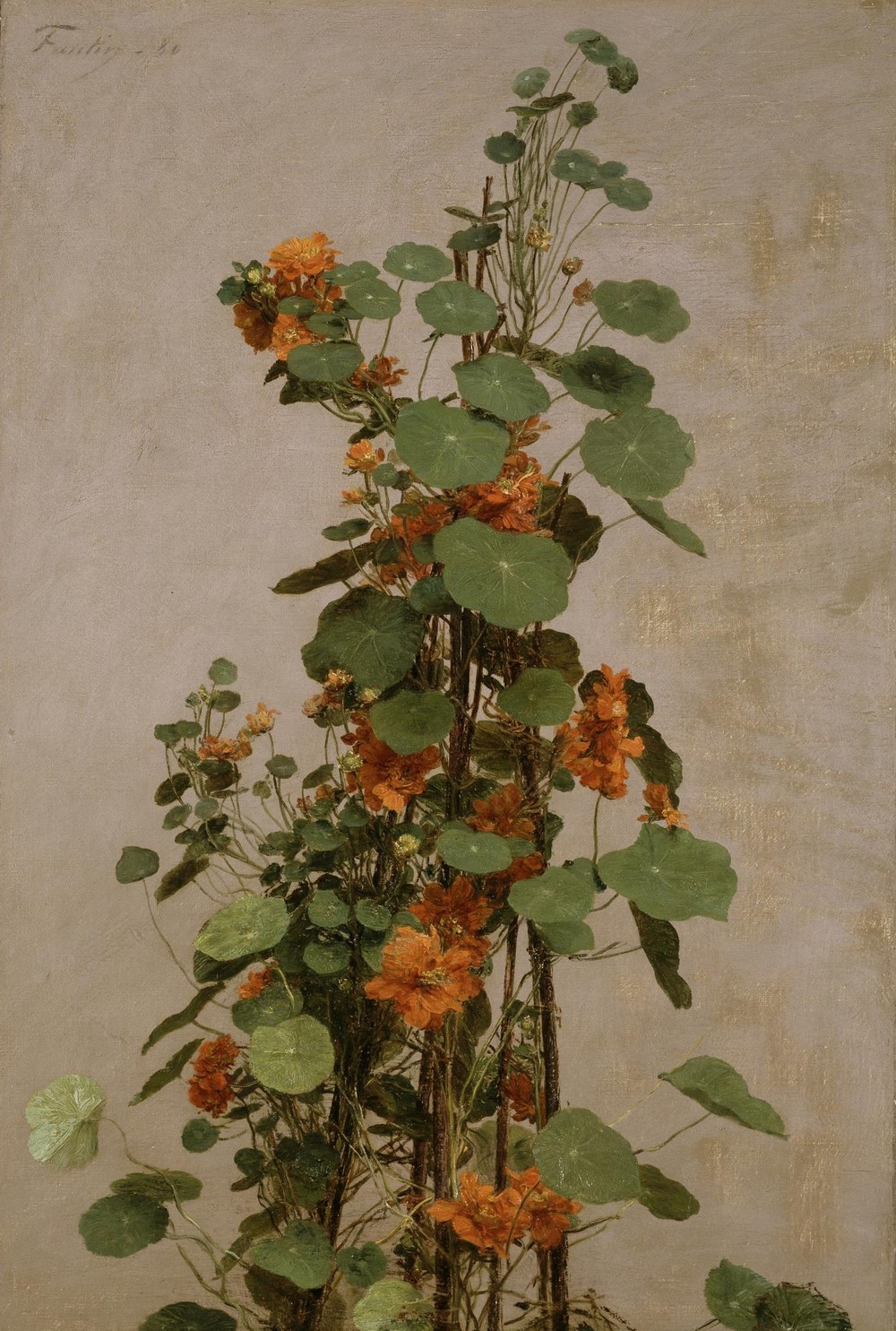 Hace unos días, me llamó la atención descubrir su pintura ‘Capuchinas’, pintada en 1880, probablemente durante su estancia en la casa de campo de Buré. En la pintura, que se conserva en el Victoria & Albert Museum de Londres, se muestran varios tallos largos de capuchinas dobles que se agrupan verticalmente en el centro de la imagen sobre un fondo gris liso. La obra fue adquirida como un «ejemplo» de pintura de naturaleza muerta, con el fin de distribuirla en las escuelas para su uso en clases de arte, ya que esta especie (Tropaeolum majus) solía servir de modelo para la formación de pintores por la complejidad de su estructura.