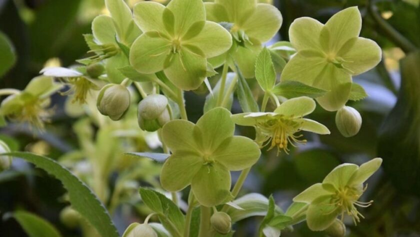 Las flores verdes del eléboro de Córcega son una muestra de que existen plantas que decididamente no quieren pasar desapercibidas. En realidad, no es solo el color verde de sus flores, sino también su hábito de crecimiento, principalmente de forma horizontal, pero que llega a alcanzar 60-90 cm de altura y diámetro (incluso más de un metro de diámetro cuando la planta es ya madura), lo que convierte a esta especie en una de las más grandes de su género.