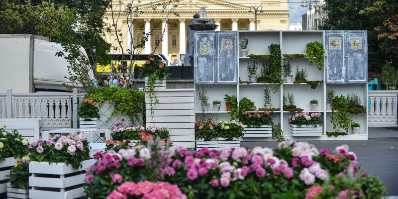 Las calles de Moscú están ocupadas estos días por jardines llenos de ingenio y belleza, de talleres gratuitos sobre arreglos florales, de puestos callejeros con bayas, frutas, mermelada, miel y muchas exquisiteces más, de música, de fiesta. Un paisaje urbano totalmente ajardinado, lleno de vida y color.