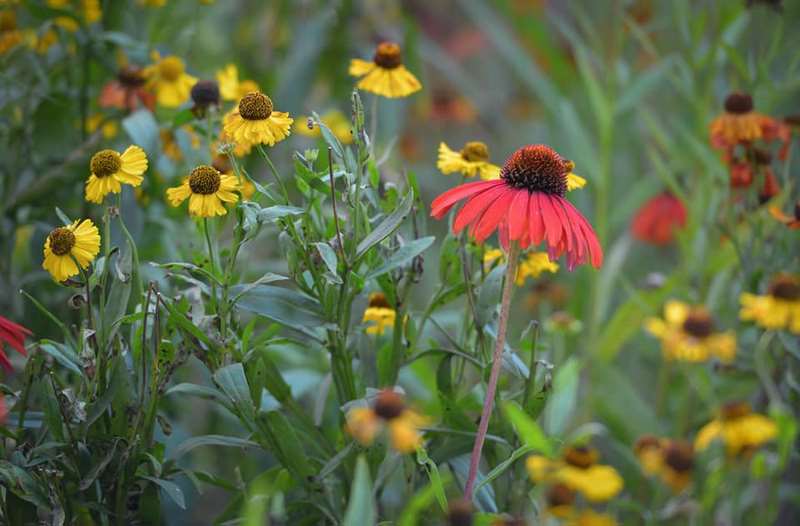 | Flores de Helenium y Echinacea en ‘Carmen’. Jardín de James Basson •• Flower Jam •• Foto: Михаил Щеглов |