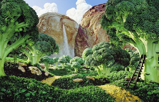 Primero se monta y se fotografía el primer plano, luego el fondo y, por último, el cielo. El resto son horas de retoque fotográfico y el resultado, desde mi punto de vista, una maravilla. Se ha utilizado para una campaña publicitaria de una cadena de supermercados británicas, pero el autor reconoce que sus imágenes son una herramienta útil para animar a los niños a ver la comida de una manera más lúdica y, por lo tanto, motivarles a una alimentación más saludable.
